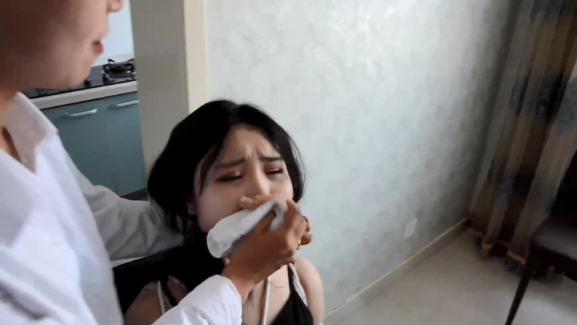 第六次塞嘴:文清拽出吴晗口中蓝色猫咪图案丝巾,不料吴晗呼救,文清迅速把这条丝巾重新塞入吴晗口中,随即脱下腿上穿的一条原味黑色连裤丝袜,拽出丝巾把黑色连裤丝袜一点点塞入吴晗口中。