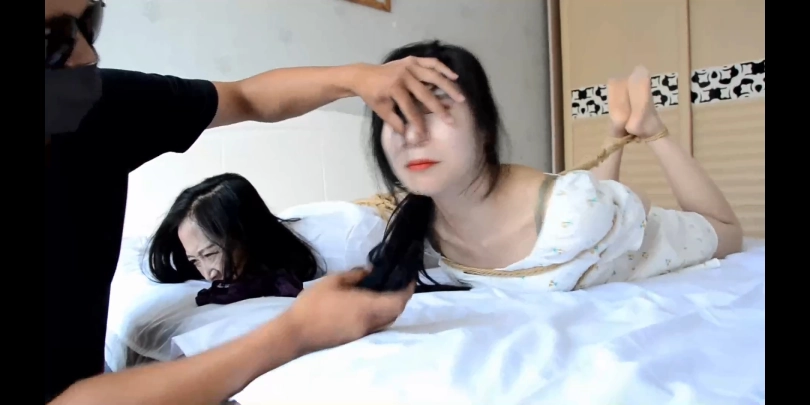 二人脚上穿上各自的高跟凉鞋,高跟鞋,劫匪离开,文清和诗涵在床上翻来覆去,一会头朝上,一会头朝下,想解开束缚,文清甩掉了脚上的高跟鞋,没有其他什么进展。二人只好侧着身子,试图弄出对方嘴里的束缚,文清用手扯出诗涵的堵嘴物,诗涵和文清侧着身子脸对脸,帮文清咬出堵嘴物(特写)。