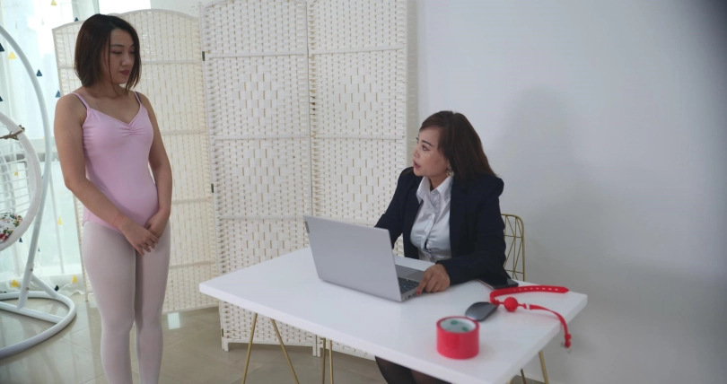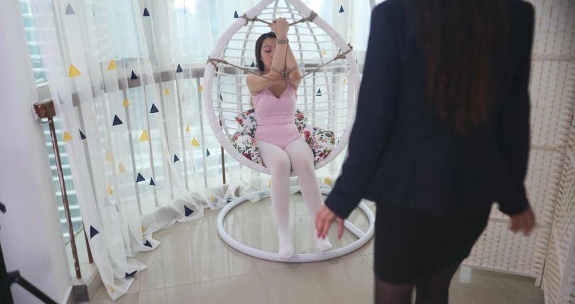 老板让女主在地上挣扎,忙完工作后走过去给她脱下衣服,还换了芭蕾服,将女主绑在吊椅上, 开始摸女主。女主急道:“这个尺度之前没有说过啊!”