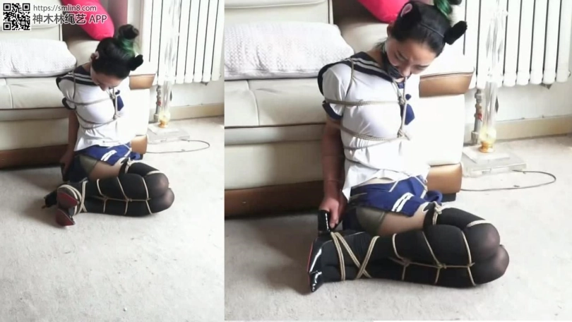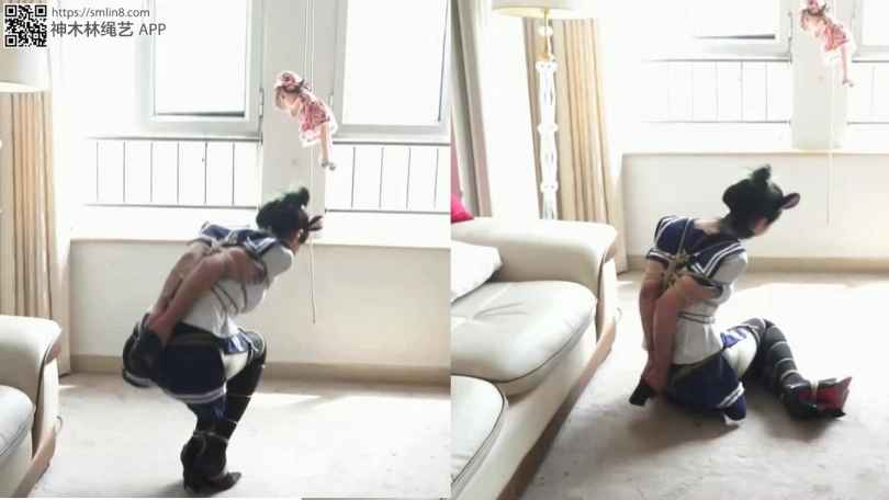 第一个挑战就是脱下高跟鞋,这在平时都不用手帮忙的事情现在却难为住了猫耳美女,高跟鞋被绳子如同蛛网一样牢牢的捆绑在她黑色美脚上,而她的手除了2个大拇指被胶带牢牢的包裹在一起,完全解不开绳子。(这也是陷阱之一,超简单的一个动作却因为我们的设计脱不下高跟鞋)