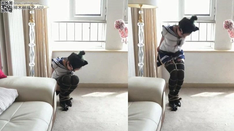 感觉被耍的美女只能用慢慢的蹦蹦跳跳到沙发边上,用沙发摩擦解开手上的胶带。