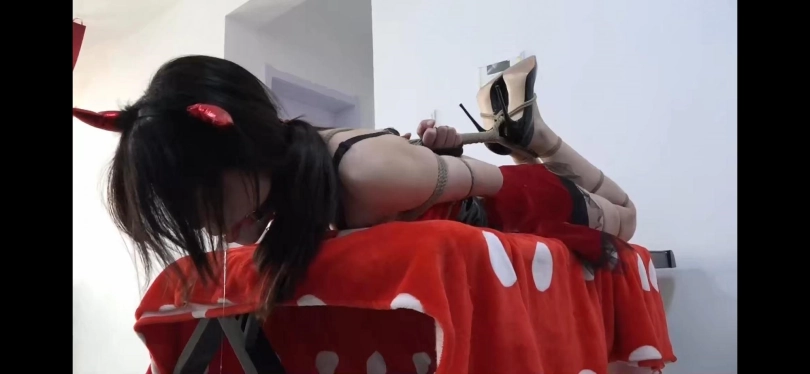 自从上次被自己的学生捆绑后也爱上了捆绑,坐在办公室中从抽屉里拿出了一副手铐脚铐给自己戴上,在拿出一个塞口球自己戴了起来。正拿着手机看着自己戴着口球的模样突然自己的学生眼镜男子推开门走了进来,猝不及防的柳洋赶紧用一本书遮住自己的脸。眼镜男子:“老师这是今天的作业,我帮您送过来了。”柳洋只是点了点头。眼镜男子见今天的柳洋有些奇怪,于是问:“你怎么了,是不是哪不舒服啊。”柳洋现在只想早点把他打发走,只是一个劲的摇头。眼镜男子觉得柳洋今天实在是奇怪,于是走到柳洋面前,发现柳洋正戴着一个塞口球于是笑着说:“原来老师你偷偷的在玩这个呀,怎么不早说了,嘿嘿。”眼镜男子先是将柳洋戴着手铐的双手举过头顶,反手固定在椅子背后,然后用一根绳索将柳洋的上半身与椅子捆绑在一起,然后将柳洋的双腿搭在办公桌上,交叉捆绑在一起,多捆几道绳子。然后拿出一个虐足齿轮说:“我最近新买了一件玩具,本来想过几天在跟你玩的,没想到你今天居然自己玩了起来,嘿嘿,正好让你看看这个新玩具。”于是用着虐足齿轮划过柳洋的腋下,脚心,这部分四分钟左右就可以了。然后眼镜男子看了看时间说:“哎哟,快上课了,不过下节课没有老师的课吧,嘿嘿,乖乖等我回来。”然后将柳洋驷马捆绑穿上高跟鞋驷马捆绑起来,放在办公桌上,于是眼镜男子将门锁好之后,留下了柳洋独自躺在办公室~