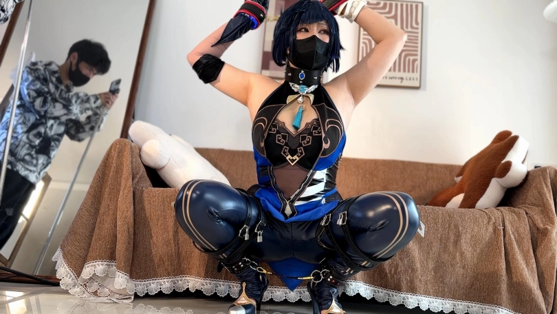 模特雁一cos夜阑进行拘束,开腿束缚带自己上锁,然后双手铐在头后,蒙眼振动玩弄,正片放置双视角