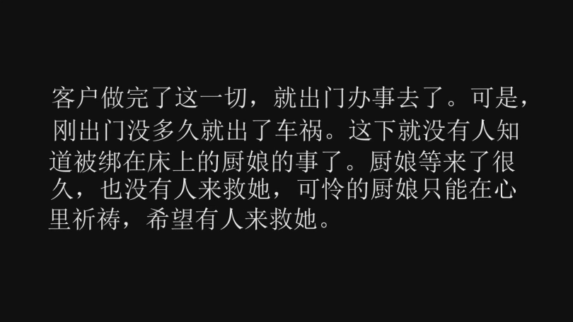 客户挠累了,就要出门转转,就把厨娘紧紧的绑在了床上。