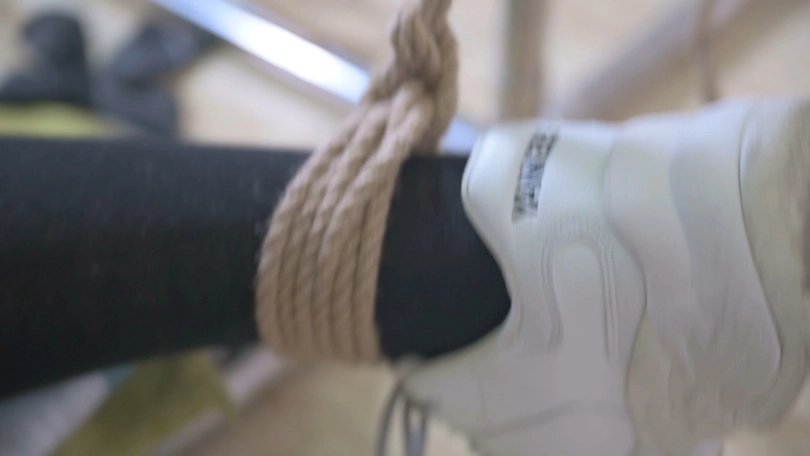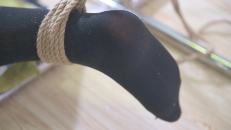喜欢穿运动鞋的大长腿模特体验铁架裍绑,先是比较简单的大字跪缚,然后是欧式直臂缚,用了一个很难受的姿势固定在架子上,特别是股绳深深嵌入到某个部位。最后给模特上身经典的日式缚,双腿M缚,运动鞋、棉袜、脱鞋、裸足都有了。
