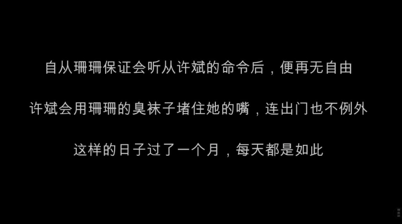 大家都很奇怪,许斌是怎么找到这么听话的女朋友的,让她做什么她都会去做,没有半点怨言,也从未顶撞过他——这是自然,嘴里一直塞着她自己的袜子要怎么抱怨呢?