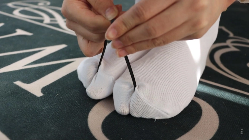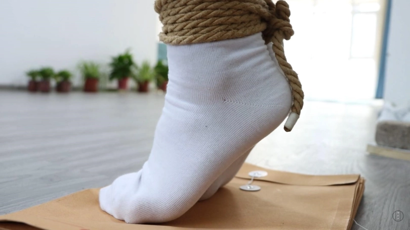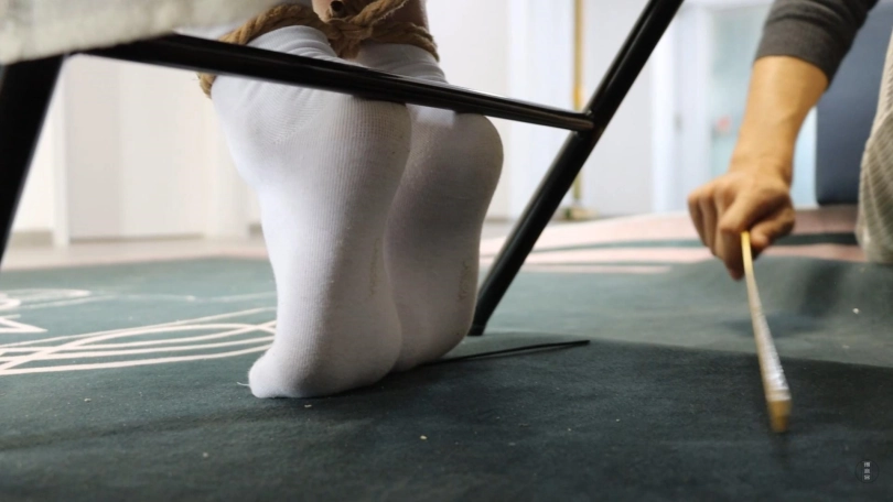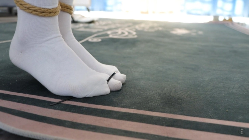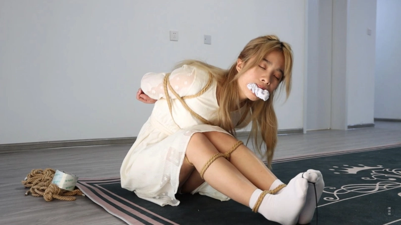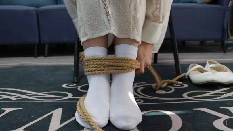 数日后的一天,许斌因外出夜不归宿,但他给珊珊留下了任务,早已被驯化的珊珊立刻执行,将自己脚上的原味白棉袜一只一只的塞进嘴里,重新穿好白棉袜后又用扎带将脚趾也绑在一起,珊珊努力的还原着许斌对自己做过的一切,终于将自己绑好后,她享受了一番。但她本能的觉得,这样还不够,便挣扎着跳到一处角落,取来了绳子,将自己更进一步的绑成驷马。