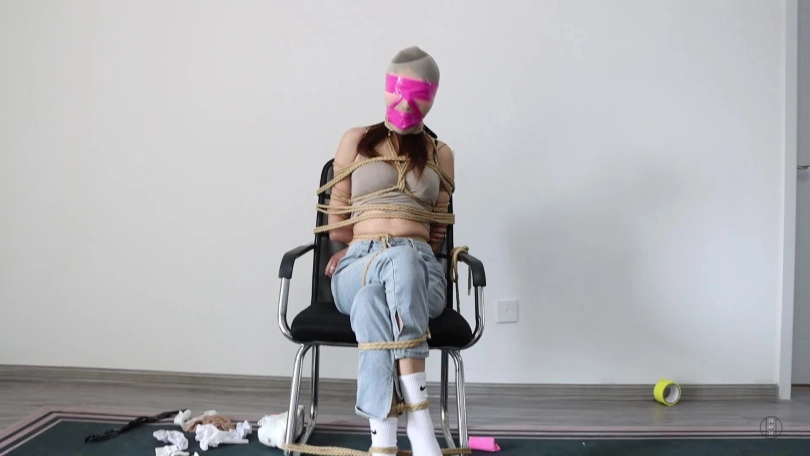男主在宿舍玩着手机,辅导员发来消息直接批评他看到消息的男主生气了,心里大骂学生会乱扣分。这时门开了,一个学姐走了进来,来到男主身边对他说:同学,我是学生会学姐,你知道现在是什么时间嘛。男主没看学姐就说到:没礼貌的东西,不知道进来先敲门嘛。学姐有点生气,推了他一下:问你话呢,你什么态度啊,这么拽。男主还是只顾玩手机说到:就这态度你能把我怎样。学姐生气了一把抢过他的手机,说到:看我还治不了你了,再把你们班的分扣扣。被抢了手机的男主生气后,站了起来推了学姐一把说到:找打是吗?学姐不甘示弱也推了他一下:我劝你不要不识好歹。男主彻底生气,冲过去,反扭学姐双手然后将她放倒在地上,再坐到她身上,学姐开始挣扎,上身扭动,脚乱踢。这时男主一手抓住她头发让她抬头,一手拿了刀子驾到她脖子上说到:早看你们学生会不顺眼了,再乱动就弄死你。学姐说:有话好好说,我都听你的。男主说:得把你绑起来才能好好说。然后拿来了绳子,接着坐在学姐身上拿来个矿泉水瓶,让她咬着瓶盖,叼着瓶子不能吐,然后反绑学姐双手,又压住学姐大腿再将她双脚抬起来将脚腕交叉起来捆绑,捆绑完双脚后,又用绳子将手腕脚踝连在一起,捆绑好学姐后,男主又坐在女主身上拿掉她咬着的矿泉水瓶,接着让她张大嘴,随后将一两双白棉袜塞满后,男主将女主头发一把抓起来,然后用白色绷带缠绕她的嘴巴。缠绕几圈后,又用黑色胶带缠绕封上,接着拍拍她的脸颊说到:正好老子要出去一下,回来再玩你。女主大声呜呜呜。男主走后,女主在地上挣扎,翻滚,不停抽动手臂试图挣脱开束缚。一会还真让她解开了,但由于脚是交叉捆绑无法站起来,她就坐着往门口挪,挪了一会,男主就回来了,看到想逃跑的她说到:妈的,还想逃跑。学姐惊慌的发出呜呜呜声音,男主踢了她几脚,然后抓住她的脚把她拖到原来的位置说到:看来得把你绑更紧才行。镜头一转:学姐被五花大绑,跷二郎腿再连鞋绑在一个椅子脚。接着男主解开学姐嘴的绷带胶带,掏出她嘴里的袜子,学姐喘了口气说:求你了,我不扣你分了,放了我吧。男主:现在求饶,晚了。然后捏住她的嘴巴,塞了块毛巾到她嘴里,外面再用长筒袜绑上,接着贴上胶布。接着男主开始挠她痒痒,脖子,脖子,腰。蹲下来脱鞋子再挠脚心,学姐呜呜呜。这样还觉得不解气,她就拿了学姐的鞋子让她闻鞋子。学姐含糊不清的说:我错了,求你了放了我吧。男主玩腻了,把鞋一丢,然后解开学姐嘴巴,掏出毛巾,学姐大口吸气,可一下子,男主又用肉色丝袜塞到她嘴里,外面再戴上红色口球,堵好嘴后,用粉色绷带缠绕眼睛,再用黄色胶带缠绕封上她的眼睛,再接着用肉色丝袜套住她的头,外面再用粉色胶带封上。套好头后,男主又用绳子加固了学姐的椅子上的束缚,接着说到:我去睡会觉,你给我老实待着。男主离开,学姐呜呜呜叫着并挣扎。