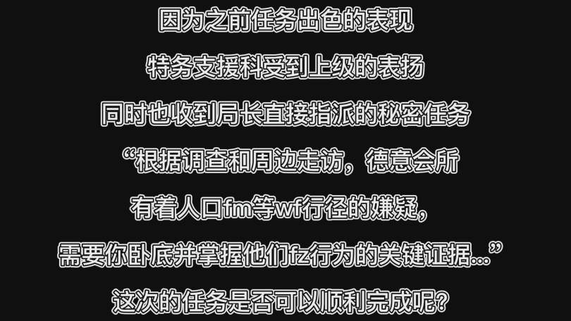 “根据调查和周边走访,德意会所有着人口fm等wf行径的嫌疑,需要你卧底并掌握他么fz行为的关键证据...”