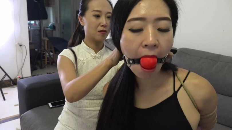 女孩(王仟雅)和表姐(文清)在家待着闲着没事觉得无聊,表姐提议玩个捆绑打赌游戏,拿绳子把女孩捆绑起来,再塞住嘴巴,给一定时间看女孩能否自行挣脱,如果能就给女孩一笔钱外加下馆子请客一顿大餐,如果输了,还没等表姐说输了怎么办,女孩就说赶快拿绳子捆自己玩,并说可以用自己脚上穿的一双短丝袜来塞嘴,表姐照做了,捆绑女孩后脱掉她脚上一双黑色短丝袜让她张开嘴塞进去,而后再给女孩带上一个塞口球。