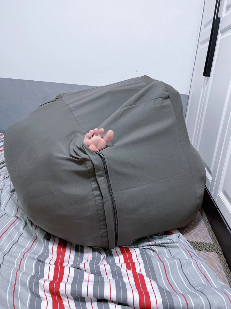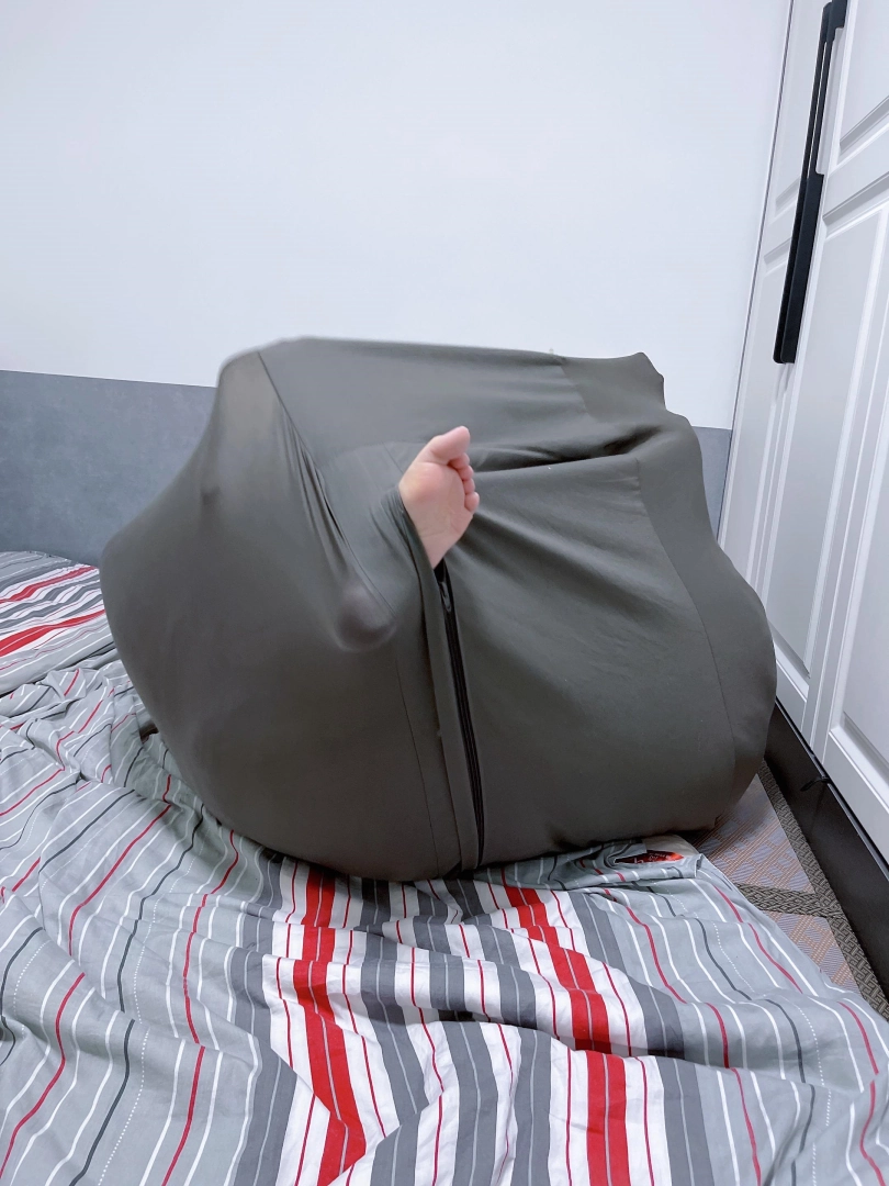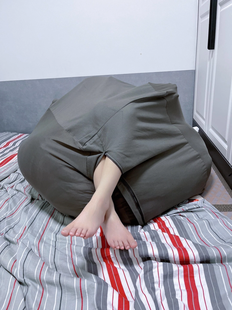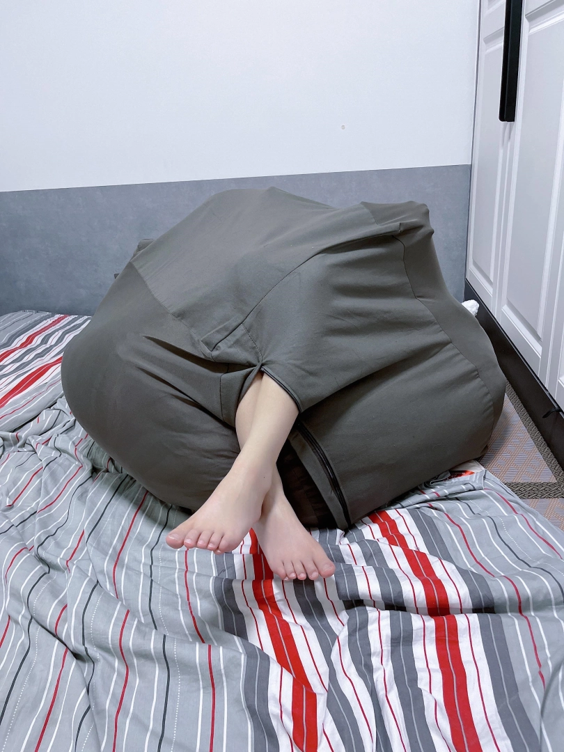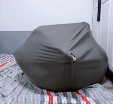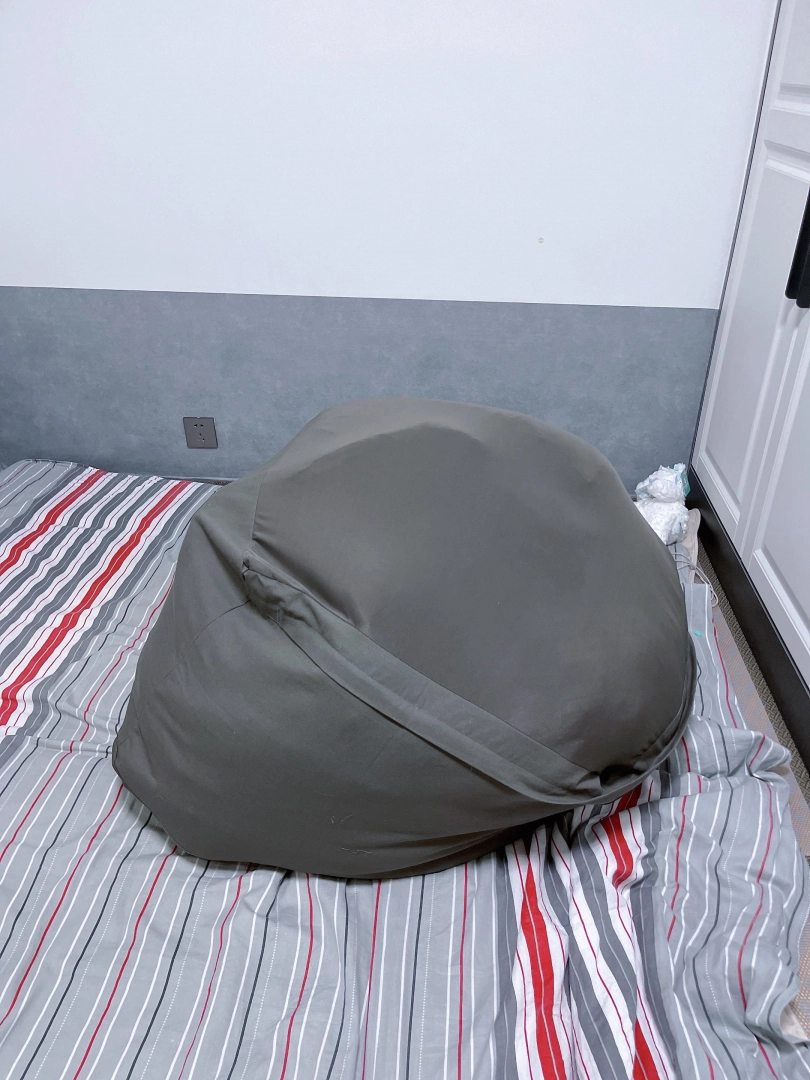 先买一个懒人沙发套,往里面填充一个双人棉被之后命令茶茶钻进袋子里。钻进袋子后继续往袋子里填充枕头、衣服等填充物,直到袋子被填满成一个鼓鼓囊囊的正方体布团。