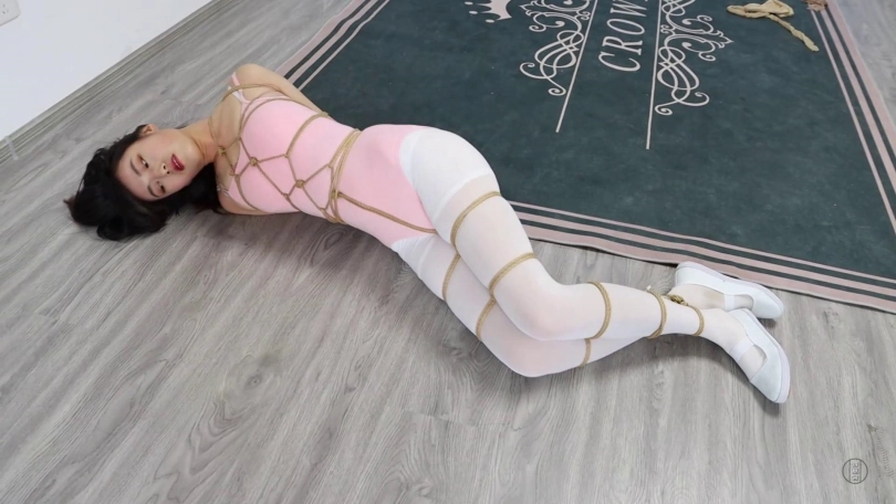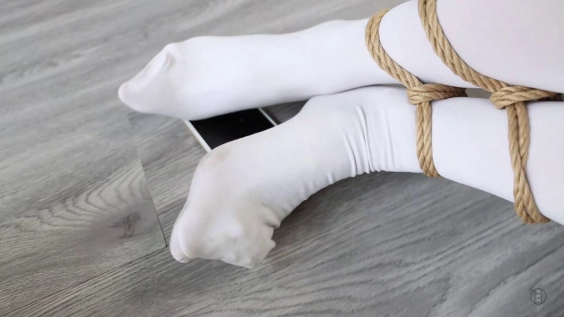 虽然上次尝试逃跑以失败告终,但是南羽还是不死心,这次又被换了一身衣服,趁着吃饭的机会还是想尝试逃跑,偶然在地上发现一部手机,又燃起了一点希望,努力挪到手机旁边,几番尝试发现手机根本没电,只能准备挪到窗户边向外呼救,希望有人能注意到她,然而事与愿违,坏人正好回来了。坏人为了惩罚南羽,把她绑成欧式驷马后用一根绳子固定在横梁上,用南羽自己的棉袜堵住嘴再透明宽胶带缠住,南羽的嘴都变形了。这种姿势下南羽挣扎了很久然并卵,最后只能绝望的放弃了挣扎。。。