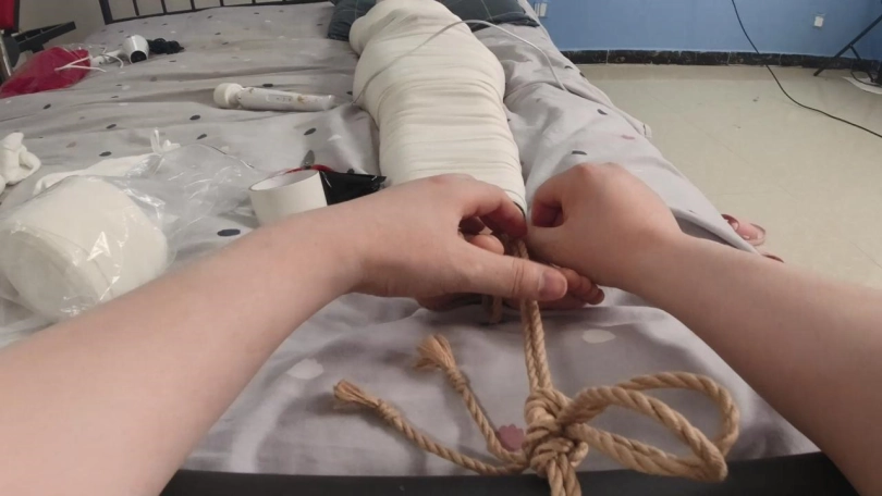 被抓回来的女孩被胶带缠绕数道,又被袜子堵嘴外面用胶带紧紧缠绕,再用绷带全包露出脚丫,疯狂挠痒痒。