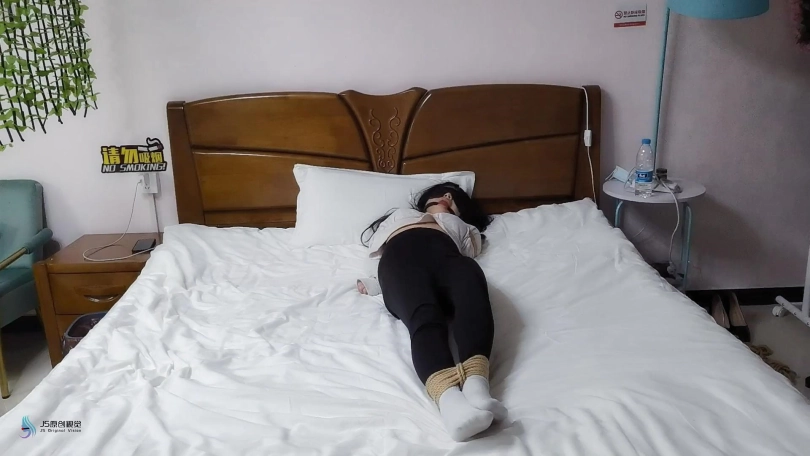 女孩下班回家,她在床上玩了会手机,很快就睡了过去。这时劫匪开门进入房间并劫持了女孩。把女孩紧紧的捆绑起来,寻找财物。独居女孩一定要把门锁好,不然。。。