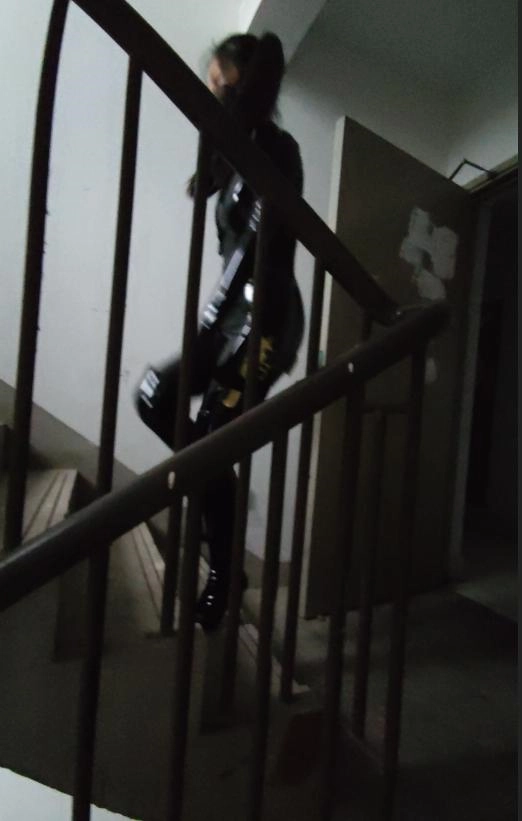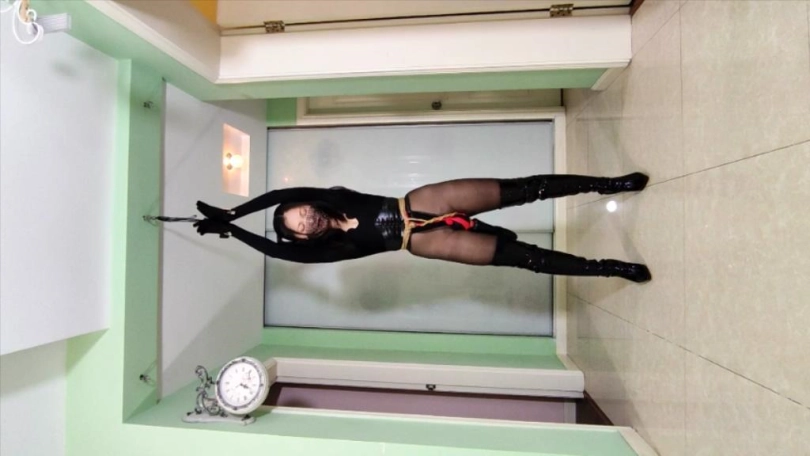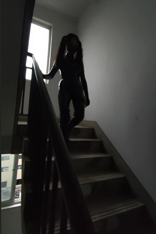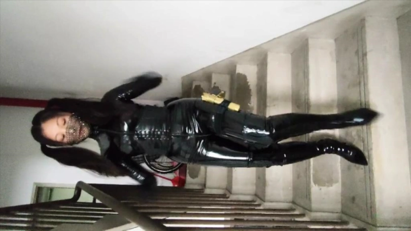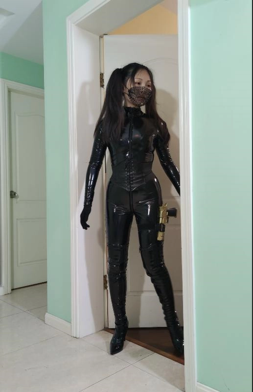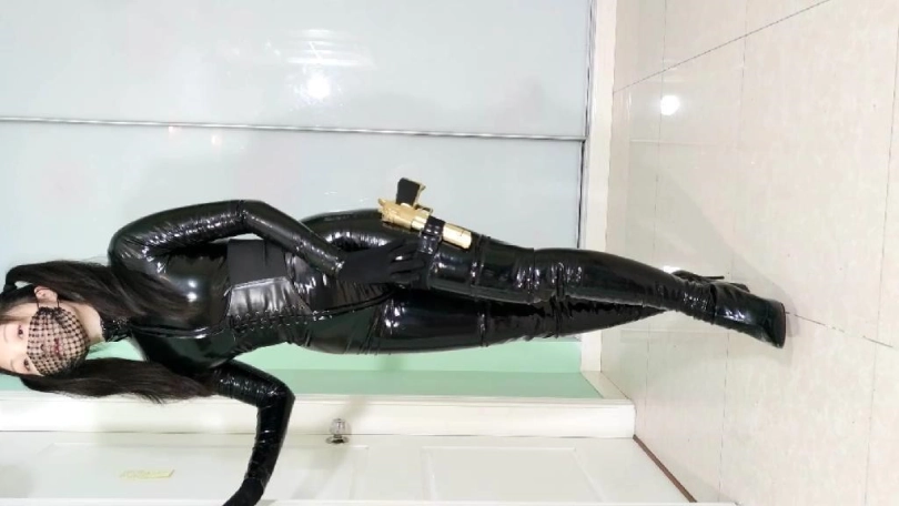 妹子开始穿着丝袜紧身衣C字裤躺在床上,用衣架把皮衣挂起来,皮衣也出镜,接到电话去解救关押的人质,于是摘下皮衣,穿上皮衣穿上黑漆皮长靴,带上紧身腰封,带上面具,枪绑腿上,出发。