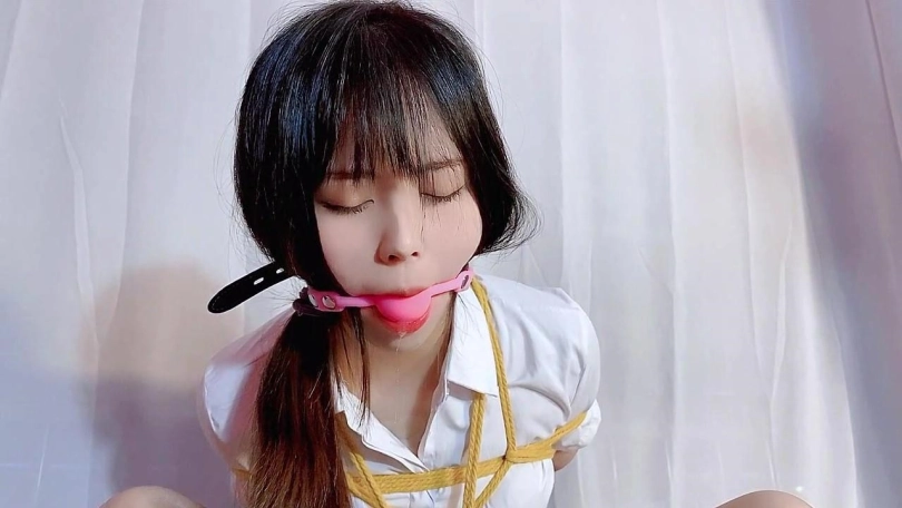 可可反手KB,双脚无法伸直,全程被KB得头都抬不起,为了好好TJ,必须把可可往后仰,才能用震动木奉顶住,嘴里塞入口球,唾液不停的往外流