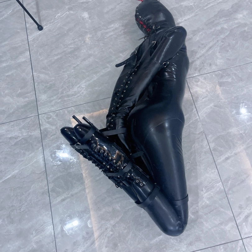 4.用拘束带链接单手套和高跟鞋的鞋跟,强制茶茶保持驷马状态。