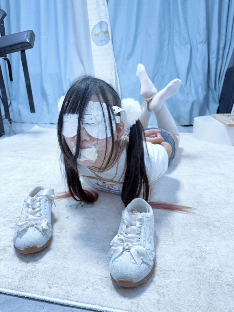 不同的是这次给妹子戴上了眼罩,并且把之前脱下的原味白袜塞进妹子小嘴里,堵嘴堵的结结实实、满满当当后用透明医用敷贴贴好。透明的医用敷料可以让大家清楚的看到堵满的小嘴~