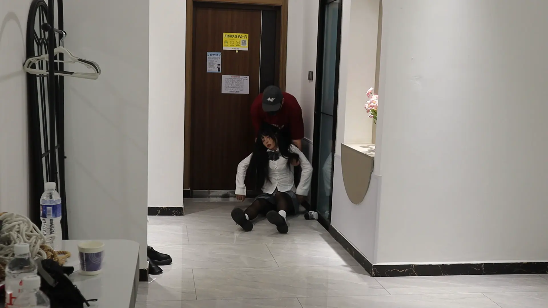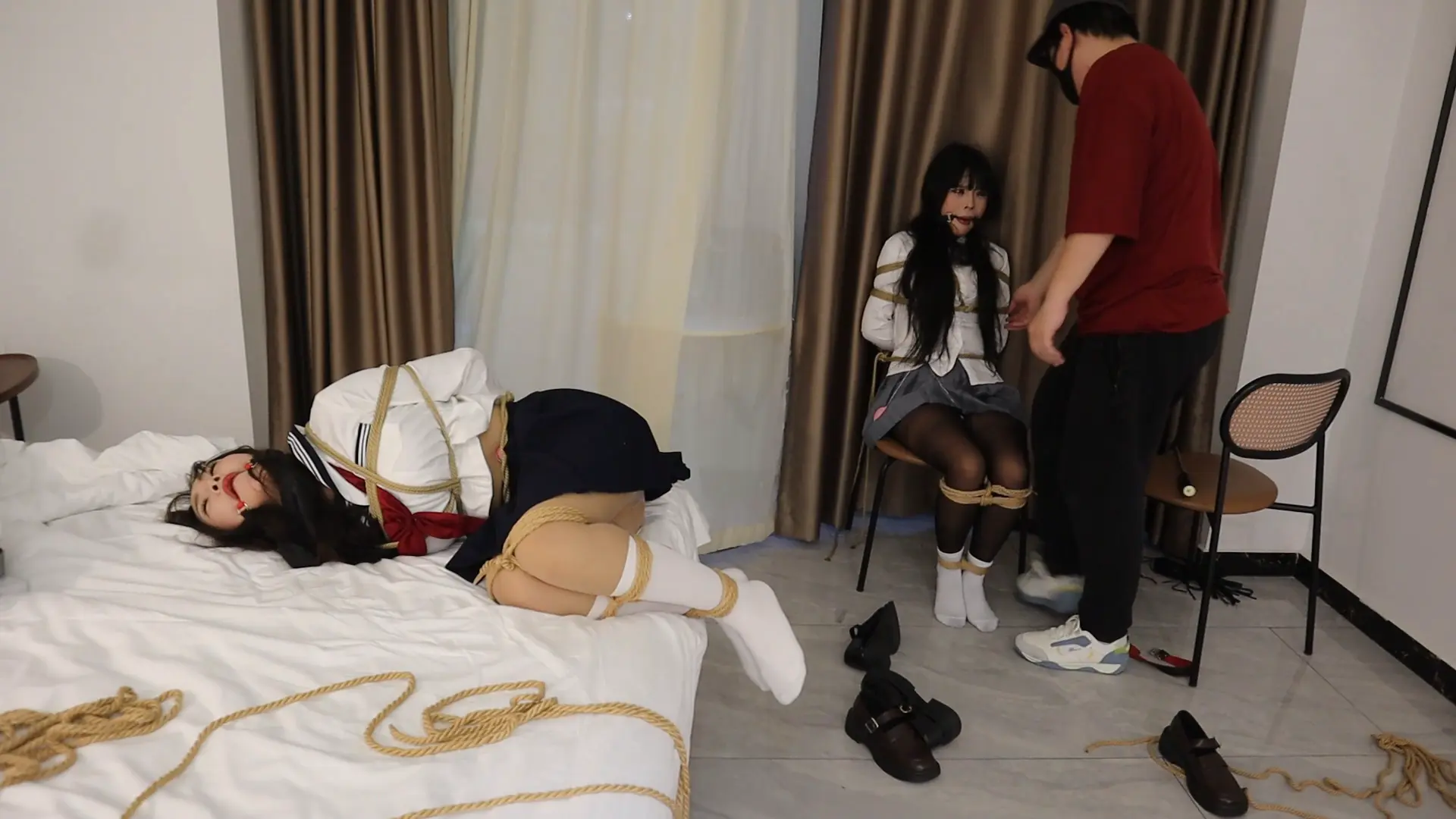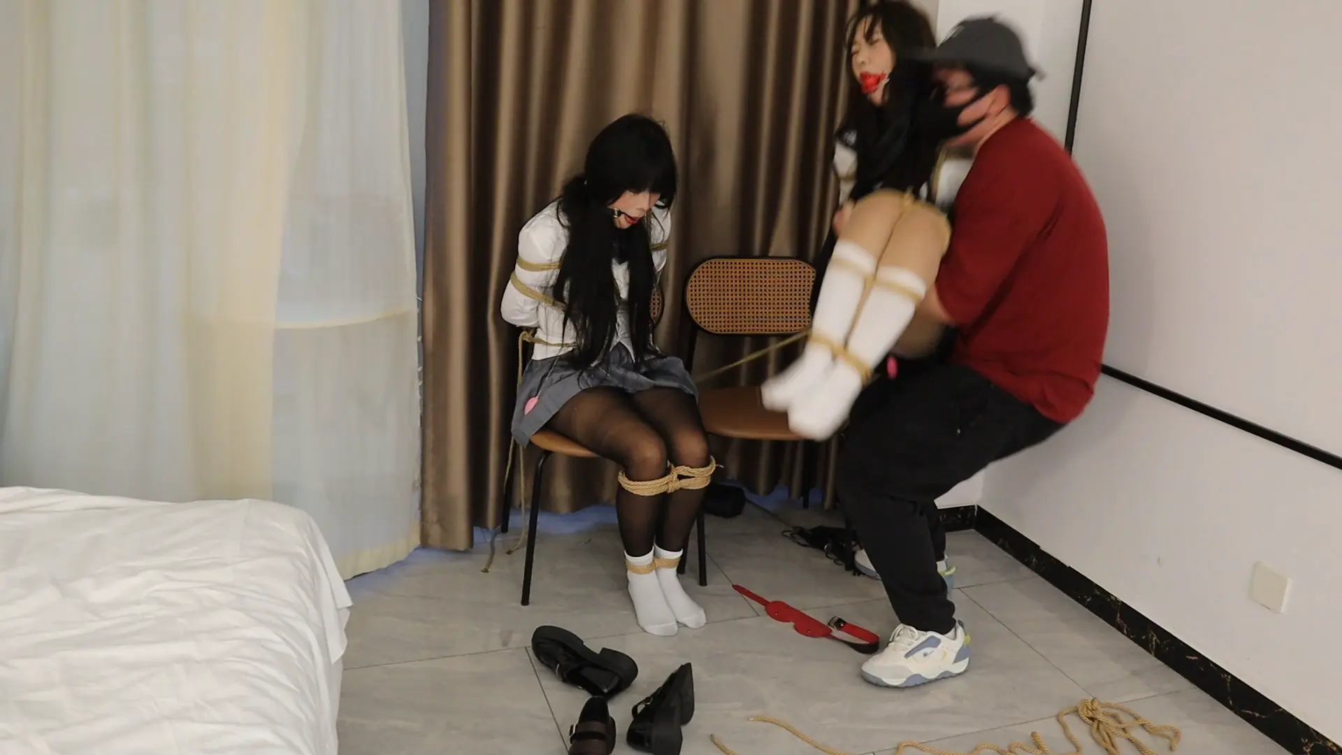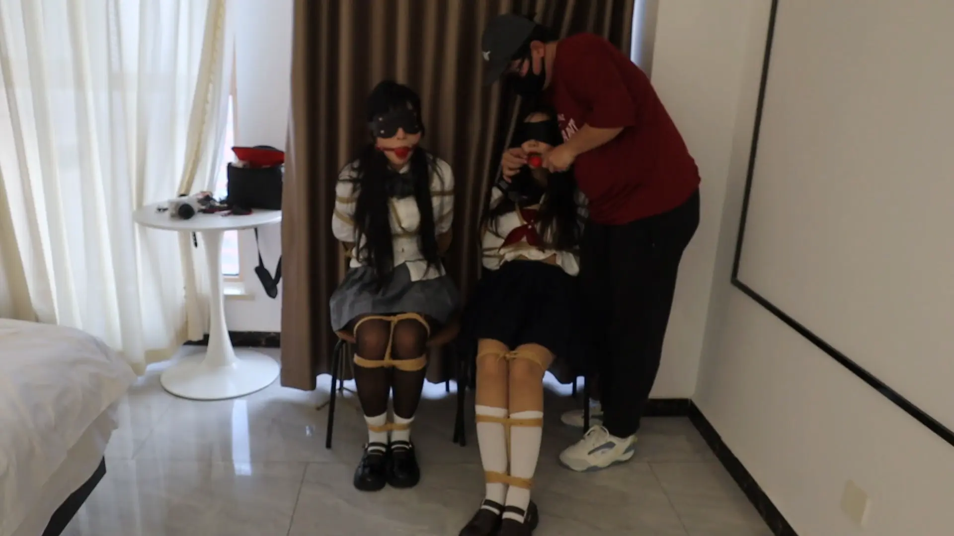 驴驴与曼妮主演,都是表演很丰富的女孩子 男主早就知道302住着一对姐妹花,非常想把这对姐妹花站为已有,一阵敲门声把小驴妹妹叫醒了,对方进门就说,一听说是修燃气管道的,驴驴还是想这不是公寓用电的吗,哪来的燃气啊?刚在想就被男人拿手帕迷住了,虽然驴驴拼命挣扎,但最后还是沉沉的睡去,在一醒来发现蒙着手脚都被绑在椅子上,这个时候女孩曼妮也回来了,看到自己的姐妹被绑在椅子上和身边凶狠的男主,立马惊呼到你要什么!结果也被男主迷晕,醒来后被按上玩具,在椅子上接受各种调教,电击鞭虐待,超痒tk,无情鞭打等两姐妹只能无力挣扎痛苦被动接受。