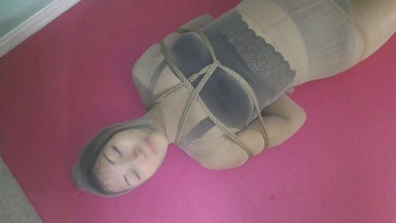 妹子被丝袜全包后,捆绑 放置 挣扎。近距离脸部特写拍摄。