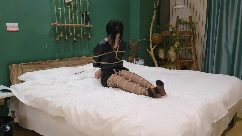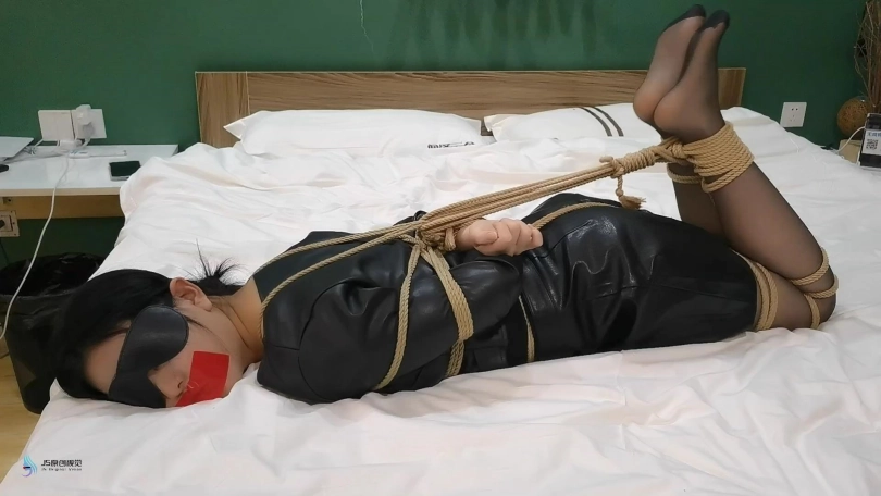就在我睡熟后,房间里突然窜出很多条绳子向我袭来。这些绳子好像有生命一样在我身上游走。身体上传来的异样感觉让我醒了过来。我惊恐的发现这些绳子缠绕着我的手脚和身体,我努力的想要挣脱它们,这时我的双臂似乎被某种神秘力量控制,开始向身后扭动,这些绳子似乎有意识,它们趁机把我以这种姿势捆绑起来,我两个胳膊紧紧的被束缚在身体上,啊,好紧啊。不行,这个房间太奇怪了,我得赶快离开这。就在我要下床离开这里时,我的双脚也被绳子一圈一圈的捆绑了起来。我无力的在床上挣扎。我刚想呼救,一条丝袜不知从哪里冒了出来,并快速的钻进了我的嘴里。接下来,我的嘴巴被胶带封住,无法突出丝袜,眼睛也被蒙上。我趴在床上努力的先要挣脱,但一条绳子缠绕住我的脚并连接到我的后背,随着绳子不断的收紧,我被紧紧的绑成了驷马的姿势。这下我彻底的动不了了。