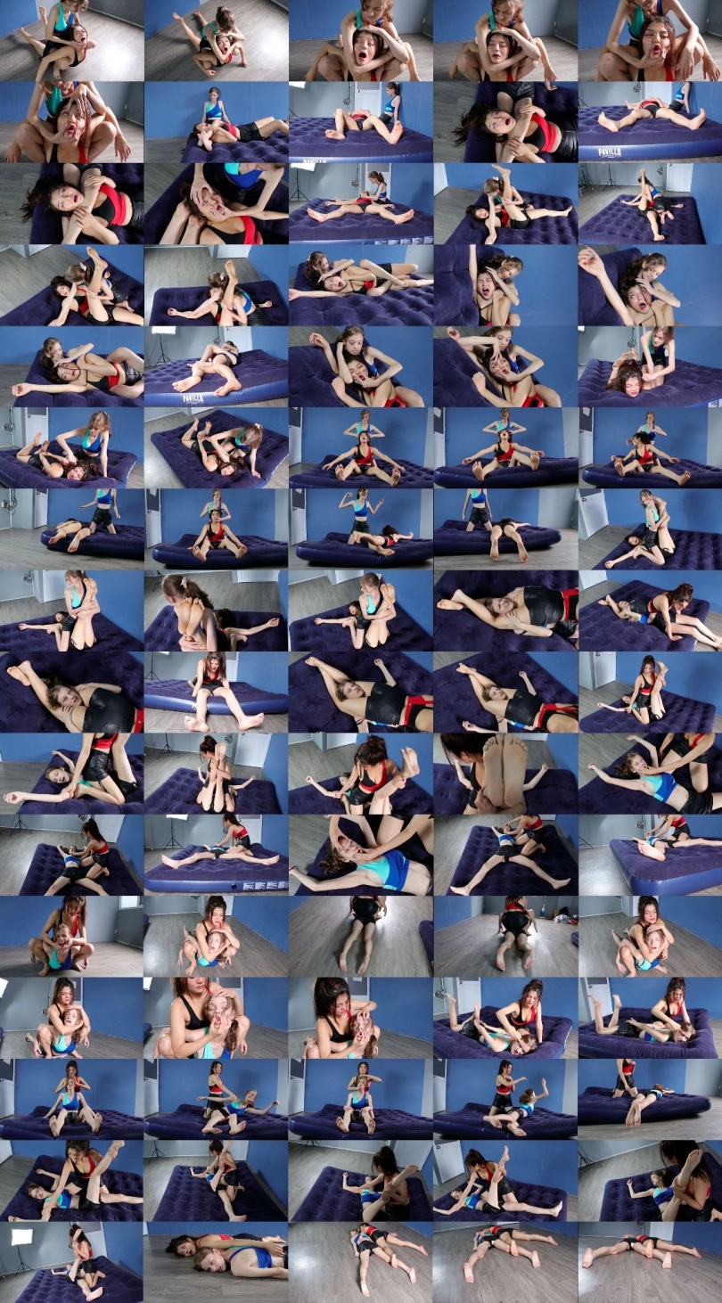 Emma (Blue) wrestles with Eva (Red). Emma got the upper hand at the beginning of the match and knocked Eva out multiple times then she humiliated Eva by squeezing her mouth and opening her eyes after each knockout. Eva then took revenge on Emma in the other half of the video. In the end, both girls manage to knock each other out and the viewer can have a nice view of their pretty soles :D