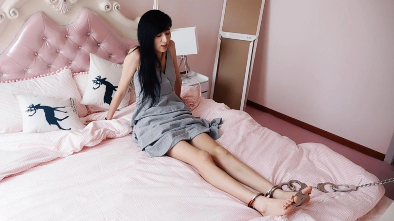 妹子醒来,发现自己被带上了脚铐,一只脚还被拴了起来,下不了床,很着急,一直拉拽却没用。坏人回来了,让妹子把鞋袜脱下来,戴上脚趾铐,袜子放在脚面上。妹子很着急,拉拽,求放出去。坏人又回来了,给妹子一副手铐,让她铐在背后,妹子被迫就范。妹子哭了,拉拽,求放她出去。坏人最后回来,换了个姿势 ,大字绑上。妹子被大字绑在床上,哭了,很害怕。