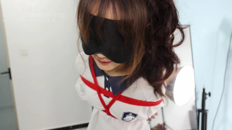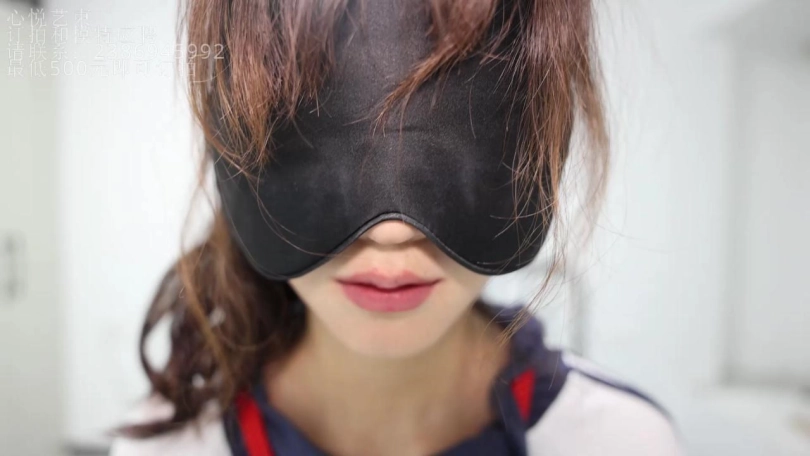 被紧缚蒙眼戴着脚镣的欢欢,在什么都看不到的状态下,用手体验一下我给她的卡片,然后要在一百多平的房间当中找到这张小卡片。是在拘束状态下哦。(PS:其实我把卡片藏身上了,她瞎找半天哈哈。)