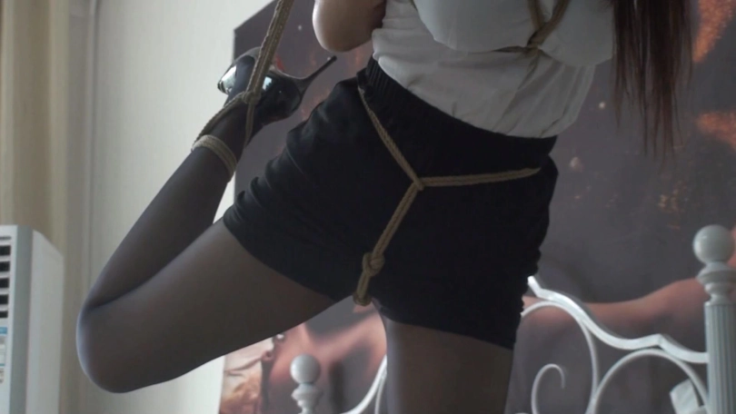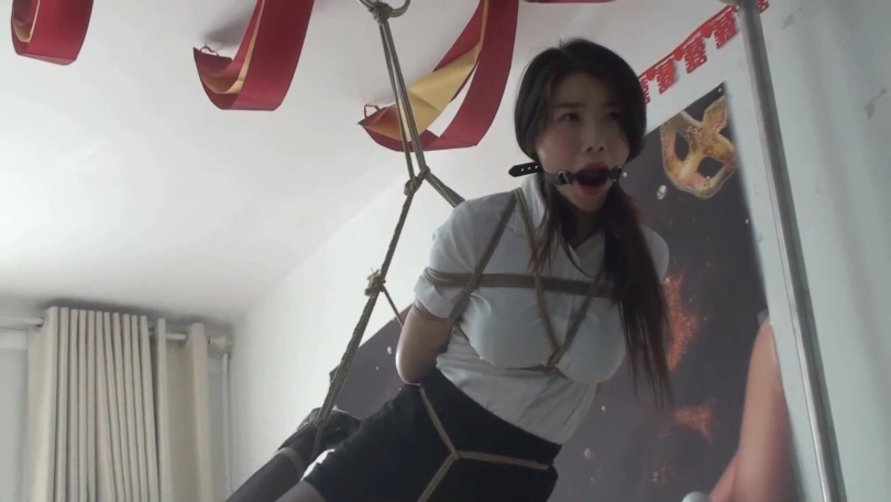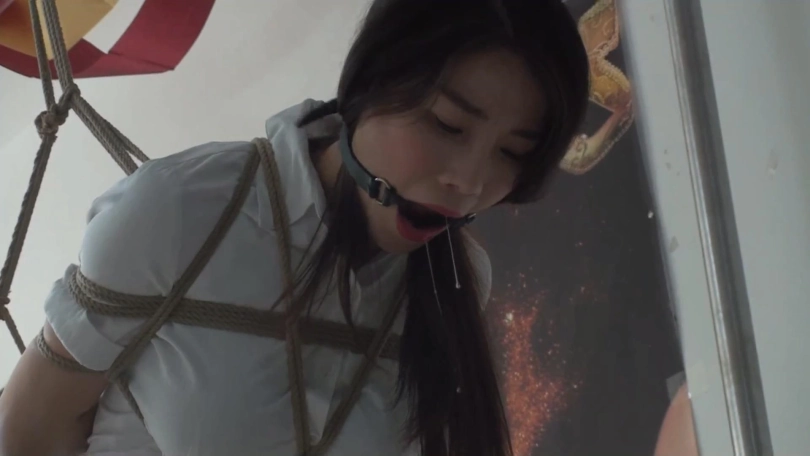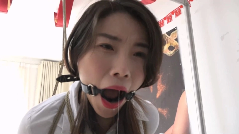 柳杨黑丝高跟白领OL套装被日式紧缚单腿吊起来,带着大口枷放置流口水,这套衣服搭配日式缚胸把柳杨的身材衬托的非常X感