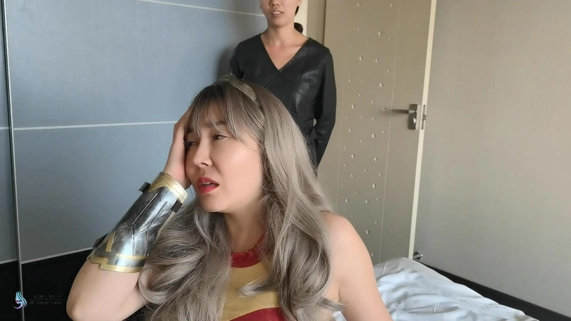 神奇女侠用自己的丝足不断的游走在毒腾女的身上。将脚放在毒腾女脸上让她闻。就在女侠玩的很尽兴的时候,毒腾女的同伙黑魔女进入房间,她悄悄的拿起药瓶来到女侠身后,朝着女侠的脸部喷了过去。女侠很快的就晕了过去。