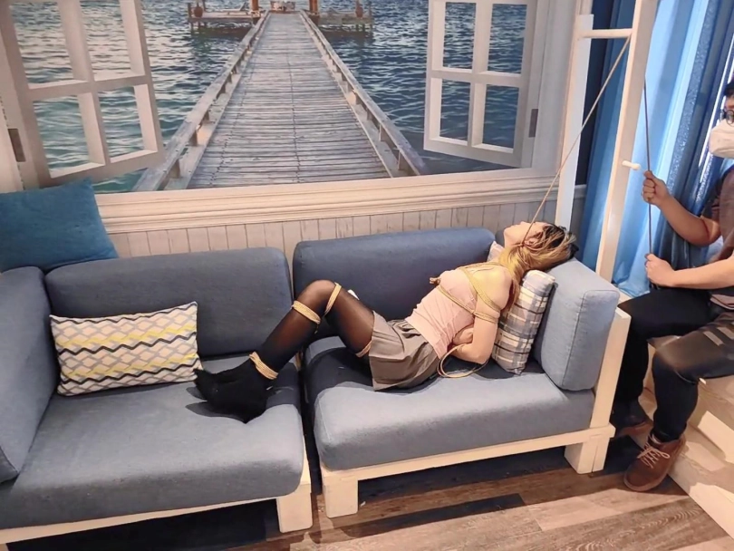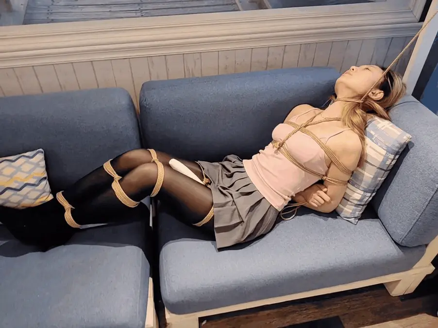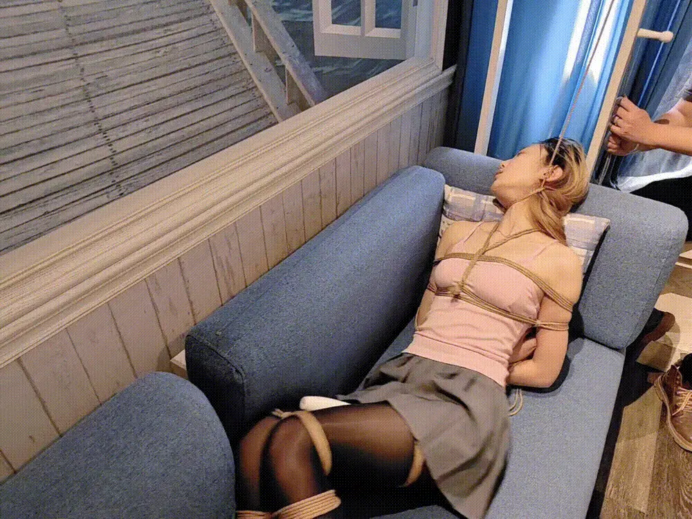 先是用绳子日式紧缚绑住上小钰半身,然后分别绑大腿小腿和脚踝。捆绑的非常严密,全身一动也不能动,非常难受。模特被放置在沙发上不停地挣扎呻 吟。放置一小会之后又在大腿根绑上了仙女棒不停震动。小钰挣扎呻吟的实在不行了,最后在迷迷糊糊里被反复吊脖子,[X_X]绞刑。直到最后承受不住去了。