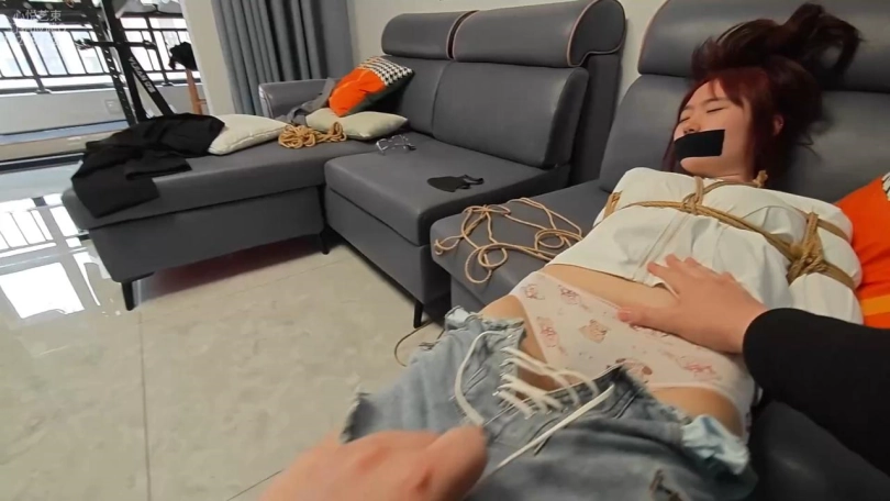 小眠是一个上班族。突然有一天,歹徒踩好了点 确定只有一个女孩居住,小眠出去上班,到了晚上下班了,债主偷偷得潜伏在暗处,一直尾随到小眠回家,开门得一瞬间债主动手了,用手捂住小眠得嘴,并关上了门,抓着小眠,给他推到了沙发上 并捆了起来1(日式后手+蛇缚)。歹徒询问小眠家里有什么值钱得东西,小眠不肯说,于是 准备惩罚小眠,把小眠用胶带(嘴巴长度就行)堵嘴了,接下来把小眠放置在了一边,于是歹徒管自己去搜钱财,文文小眠趁此在脱束准备逃跑报警,可歹徒什么都没有搜到,于是想到了小眠得手机里面有钱,歹徒回大厅准备询问手机的支付密码,可正好直接贴脸了,逃脱得小眠逮个正着,歹徒怒了,把小眠重新捆绑1了起来,并蒙上了他得眼睛,并脱他们裤子,询问了一会手机密码,见小眠不肯说 歹徒让小眠带开口器,然后压着小眠去了大厅绑成了走绳的姿势,来回走绳。后面逼供无果 歹徒觉得不过瘾,把小眠得内裤掀开塞入了一个最大档得TD(此时还在问小眠爽不,再不说就让你们更爽)此时,小眠的口水疯狂得再留。刺激了一会,见小眠还是不肯说,先把小眠得开口器拿了下来,然后把小眠得[X_X]拿了出来并把小眠放了下来,把腿松绑了(手还是绑着得),“爽不,不说好办,那就接着玩”于是压着小眠去了房间,用站立铁架束缚住,流口水。