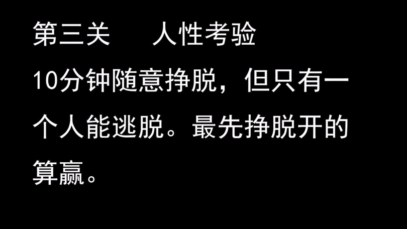 面具男说第三关,人性考验,10分钟随意挣脱,但只有一个人能逃脱。最先挣脱开的算赢。