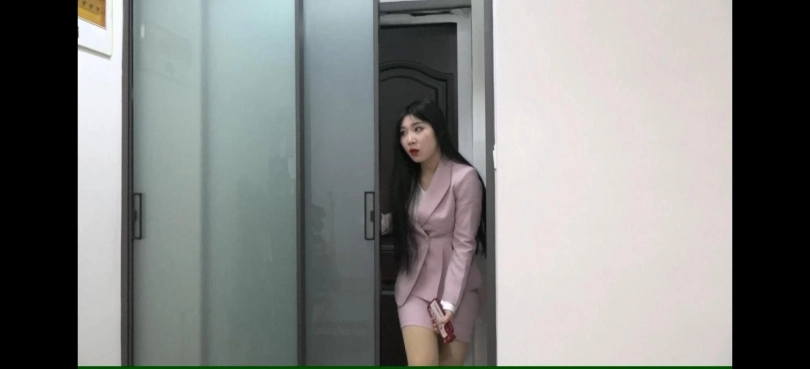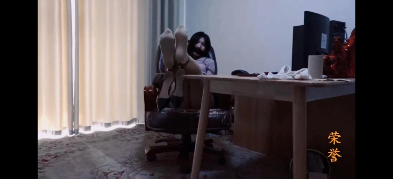 女秘书杨小莹,穿着粉色制服和厚肉丝袜,被绑在椅子上,黑胶带封嘴。