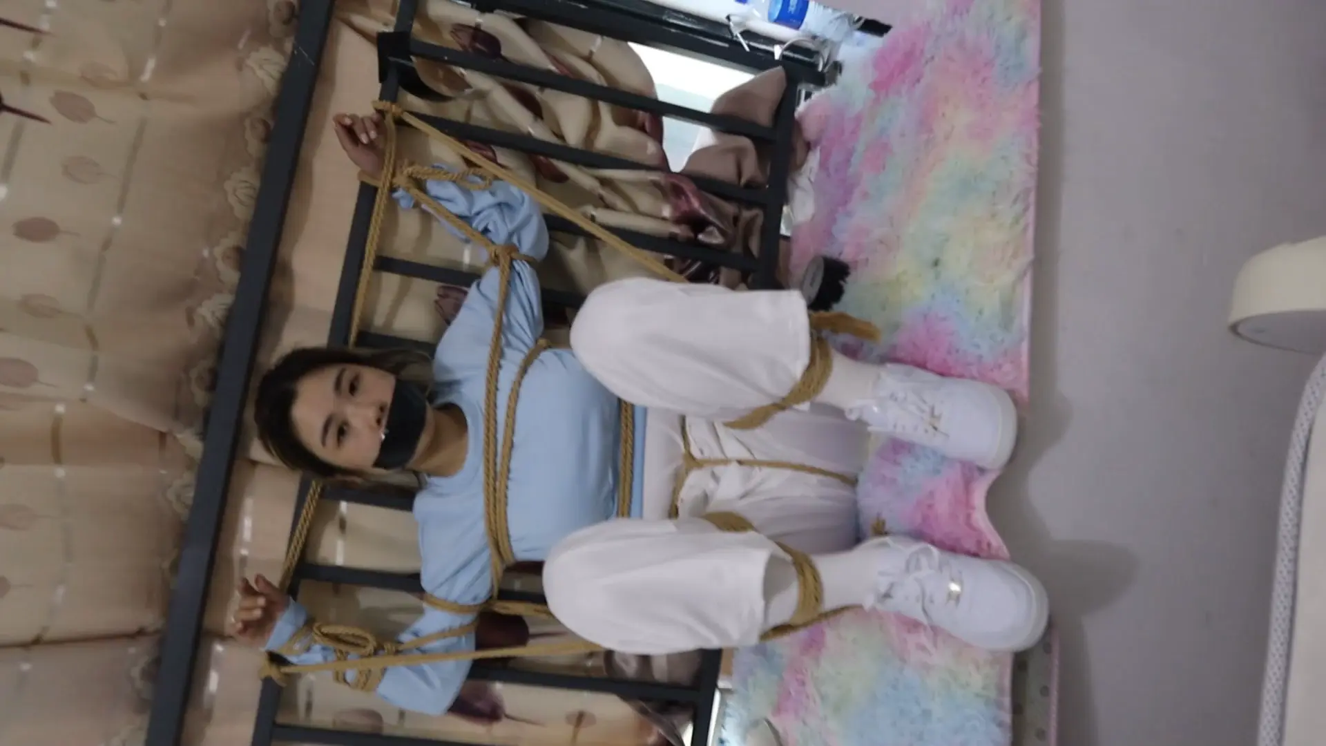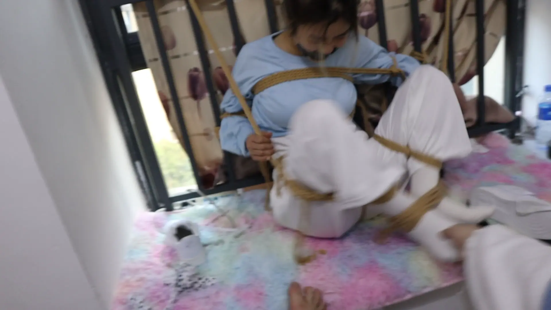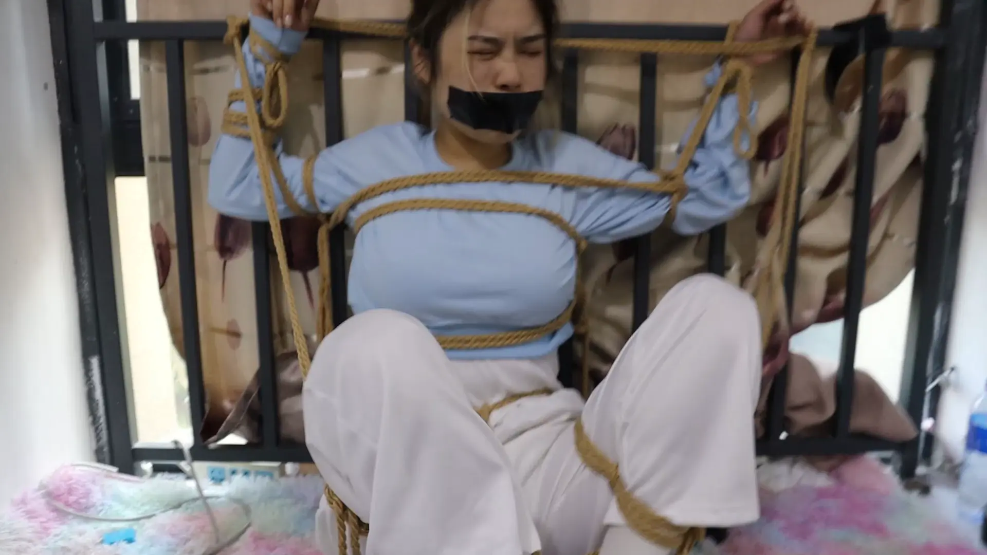 纯干货剪掉多余捆绑和解绑动作 刚烈女孩H好久不见,一见面就死死的绑在栏杆上,堵上嘴巴,
