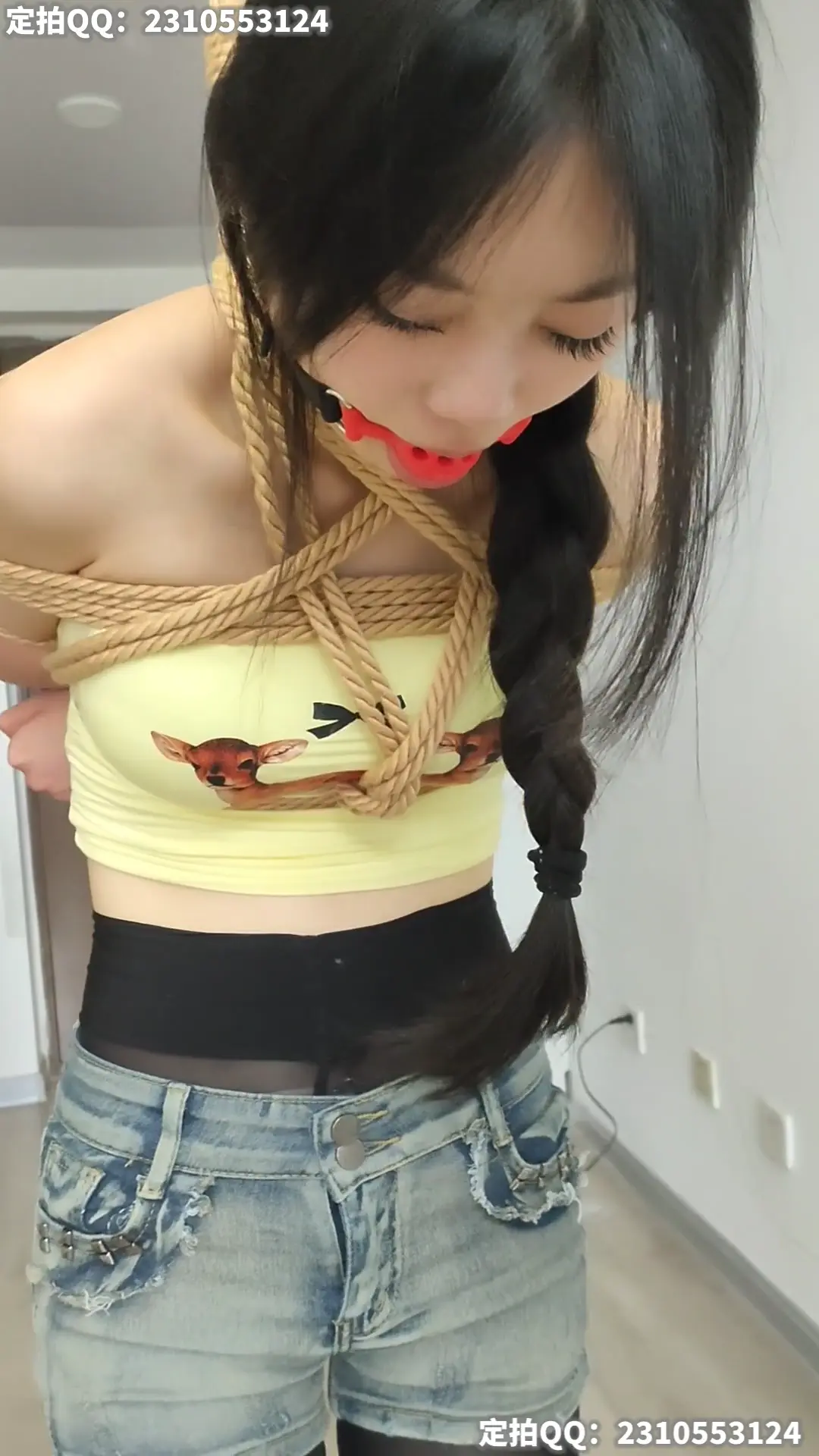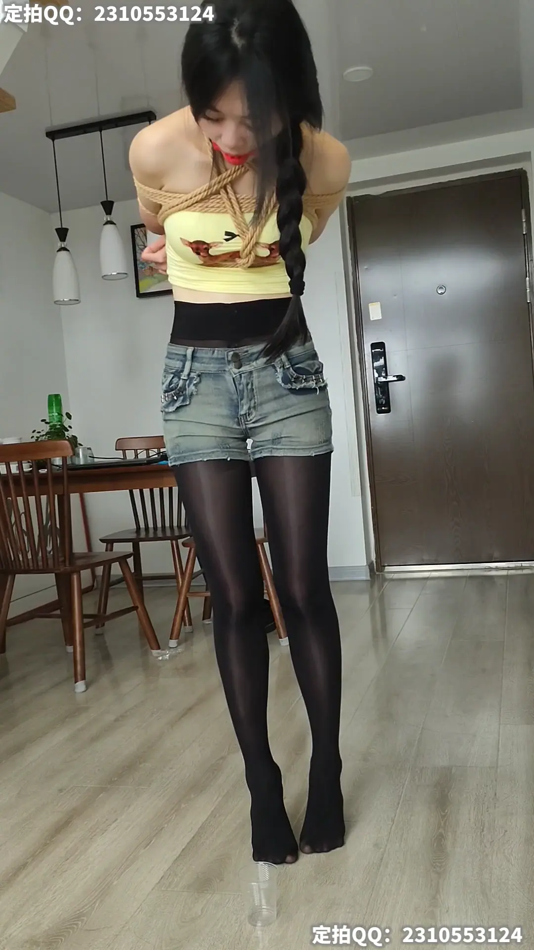 模特穿短裤黑丝被半悬吊带上口球,脚下放杯子收集口水,脚尖能刚好接触地面保持20分钟
