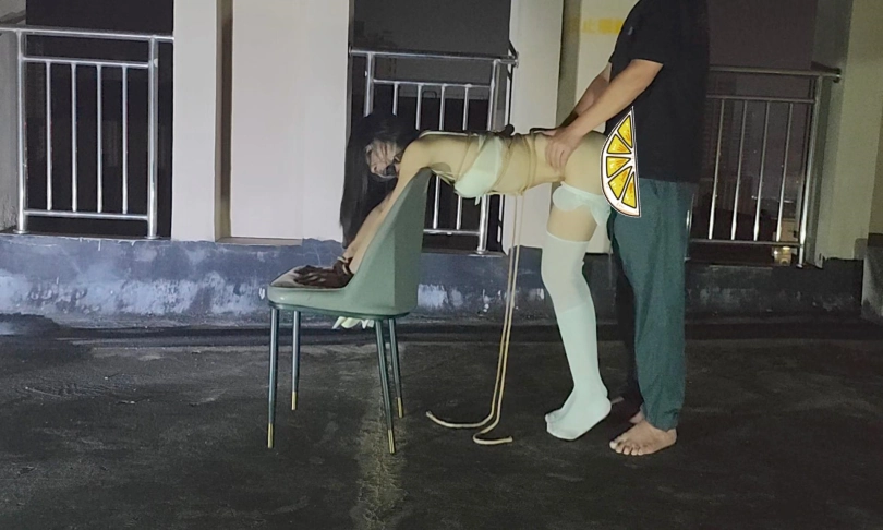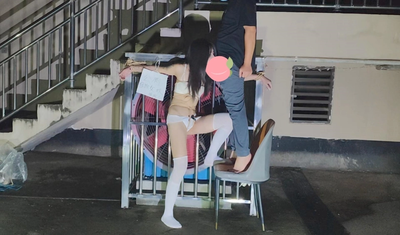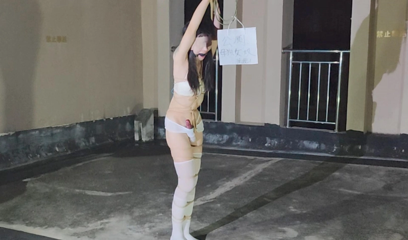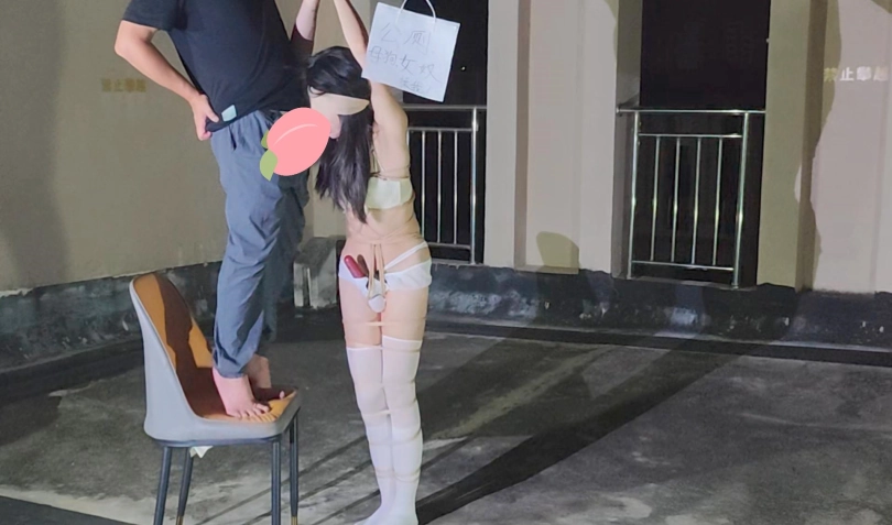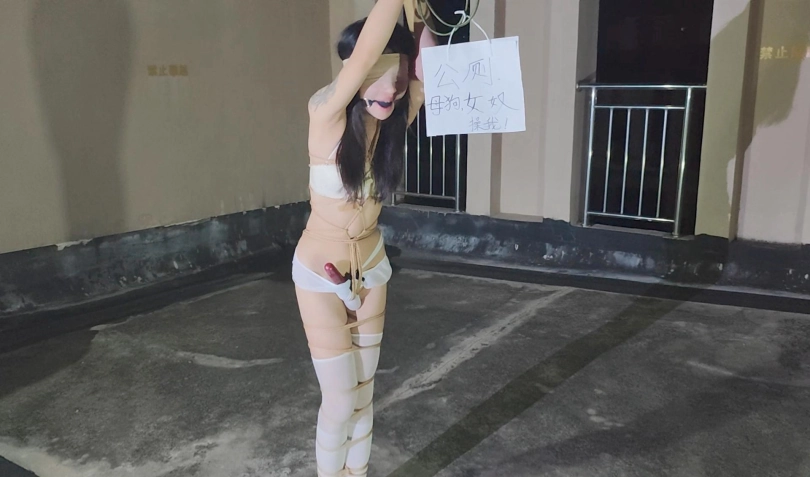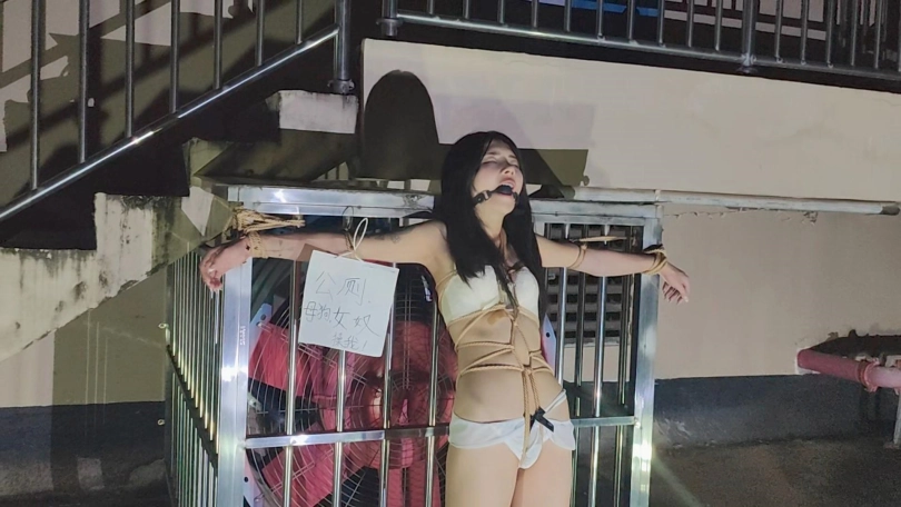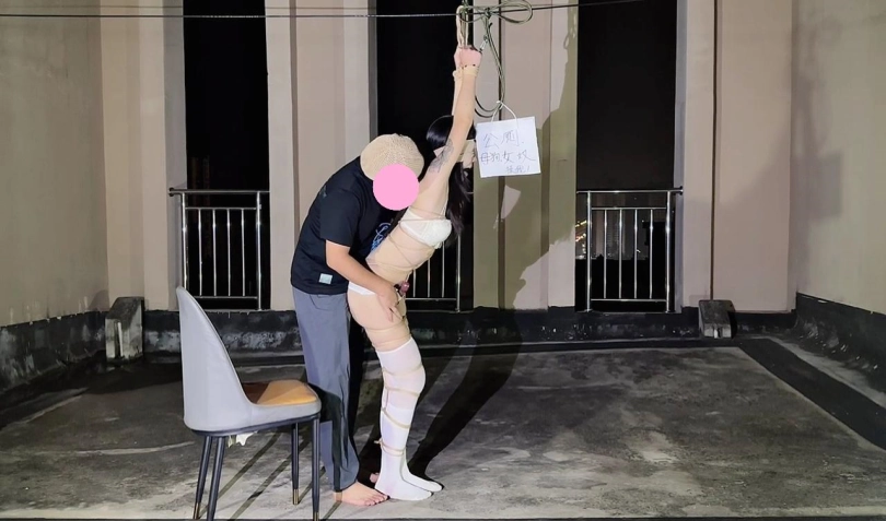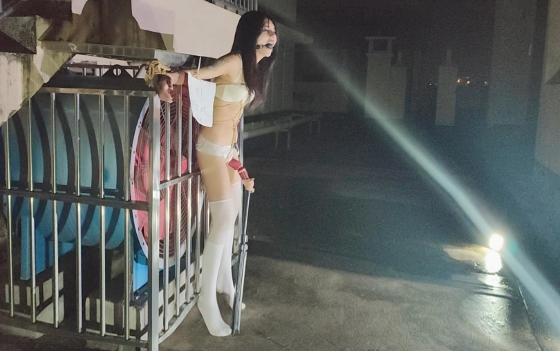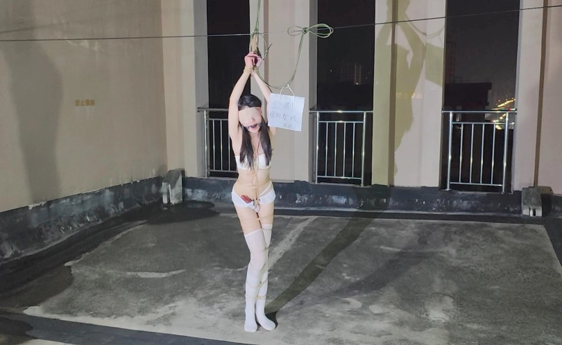 夜幕下月光还是不太强,需要灯光才能看得见,捆绑好之后,一切准备就绪,挂好条幅,上面的字写得清清楚楚,我想正常人应该都能懂吧!经过各种吊缚,强高,大字缚之后,开始实行今晚的计划,等了好久终于等到了一个老头子上来天台看月亮!!!只见他蹒跚着走了过来!!!!无法言语的悲伤!!!