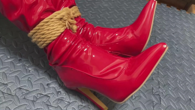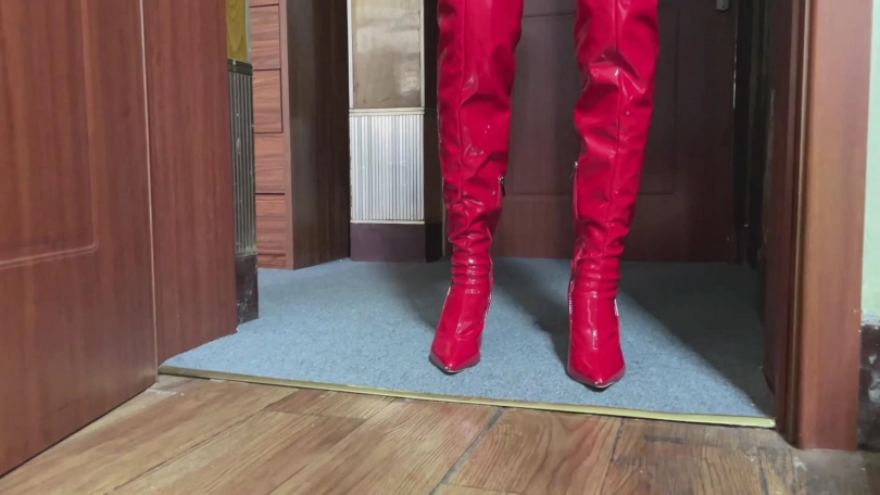 油亮黑丝包裹的双腿穿着彰显她气质的红色过膝长靴。