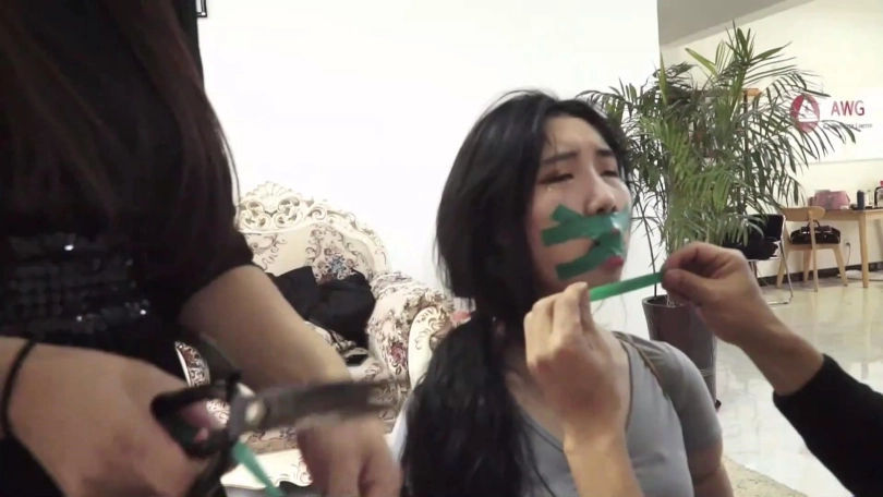 片段3:逃脱未遂的吴晗与自己男友被李然和锁哥擒获,锁哥和李然分别脱掉自己穿的原味臭锦纶丝袜和黑色连裤丝袜塞到吴晗和吴晗男友嘴里,再用绿色胶带一条条封在他们嘴外,黑色胶带与紫色弹力自粘绷带来回沿二人脑后缠绕封嘴。