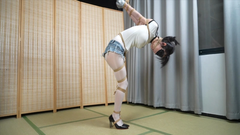 双手被胶带缠起来以后做并肘直臂,大腿小腿脚腕鞋子都用绳子加固