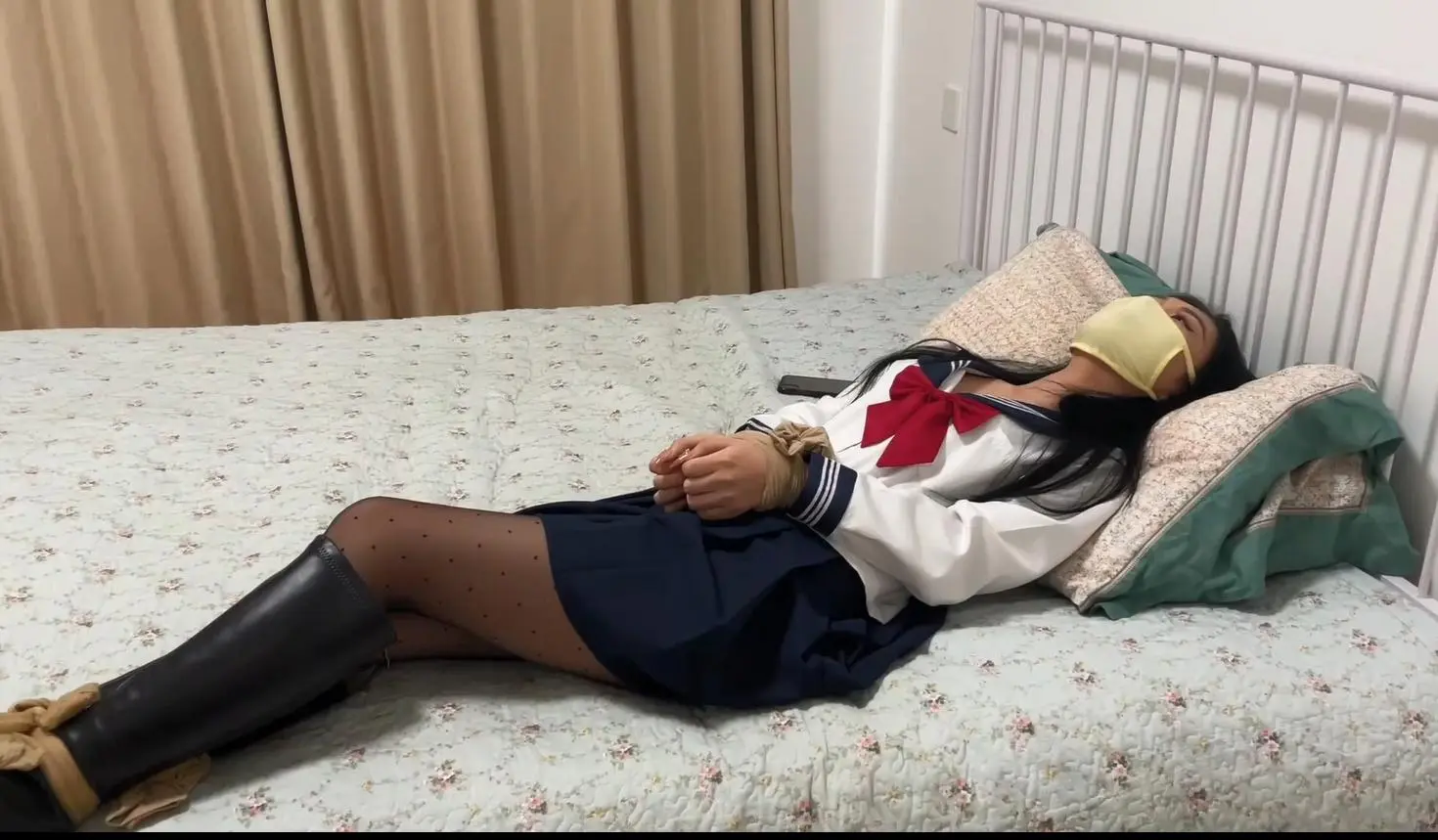 说完诗萌把药水喷在口罩上用丝袜绑上自己的双手双脚,带上口罩躺在床上,两只脚来回扯动死亡摩擦大腿发出沙沙的摩擦声,并且不断“呜呜呜”地闷哼着。