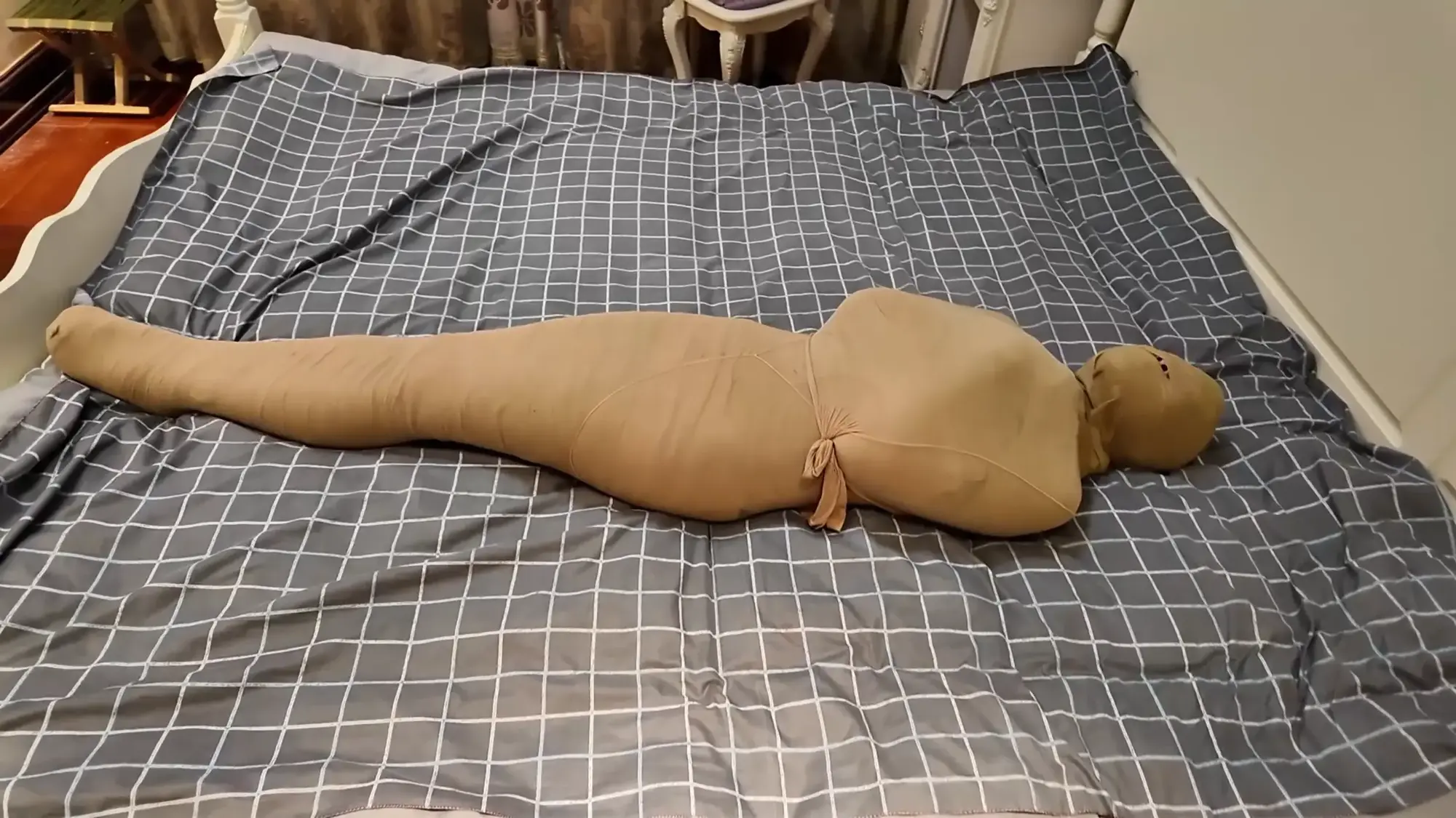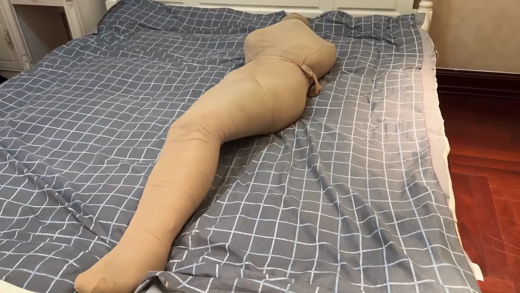 男友先把她带回房间, 用绷带全包起来,也把绮雯的脚、一起包裹起来, 绮雯看着被包裹成虫子般的自己,非常着急,却没有一点办法,接着拿出丝袜套在她身上。她已经感到了呼吸困难,想挣扎但又使不上劲,只能眼睁睁的看着自己被包裹的严严实实。
