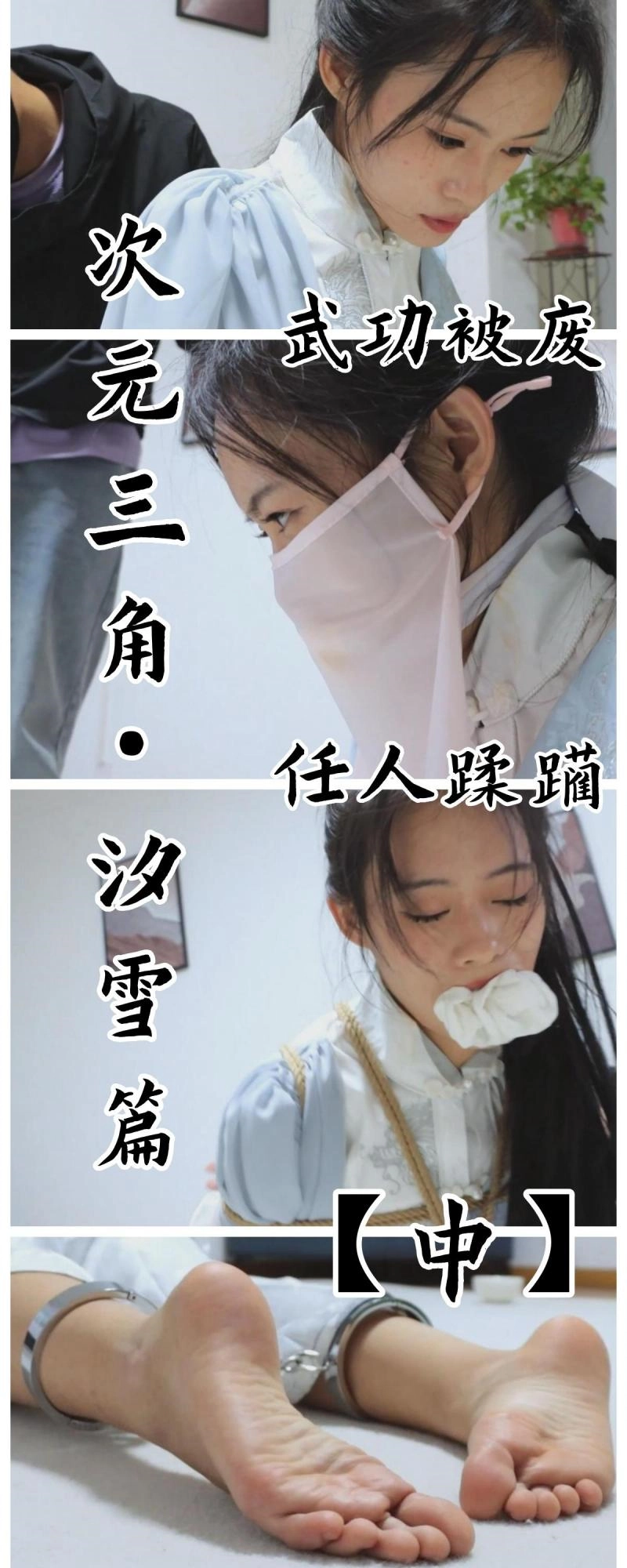 【亮点】新模特语汐女侠古装登场+被贼人暗算中毒,被东洋绳缚术绑住+依靠腿功奋力反抗,然而却被脱掉靴子,点了穴道动弹不得+被贼人用丝绸手帕堵嘴后极限驷马,如果不能挣脱的话将会武功尽失,变成废物美女。