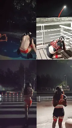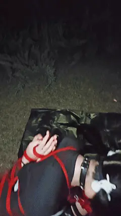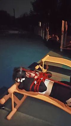 之后露露被带到天桥下,在长椅上继续折磨电击,随后便拿出包里的道具————野餐垫、眼罩和一捆绳子,露露现在要被海老缚放置在无人的公园草地!