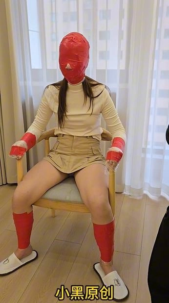 › 【小黑】胶带椅子拘束逃脱挑战,胶带全包头,保鲜膜再缠上,她疯狂挣扎,我依然不给她解开,最后惩罚是打开门给她放门口。