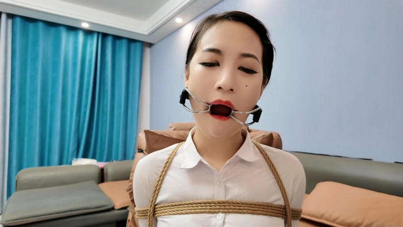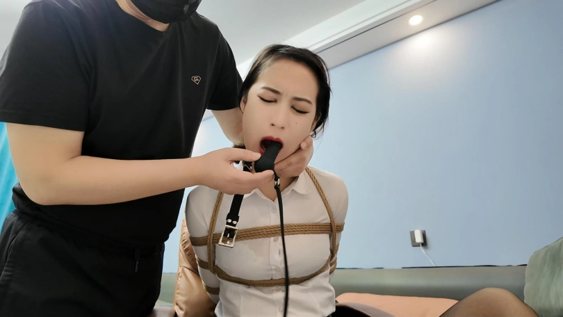 晓倩被后手观音,腿绑到椅子上,绑上股绳玩弄,口球,阳具口塞,口伽,丝袜,各种堵嘴,这是拍摄以来晓倩口水最多的一次,阳具口塞更是干呕不止