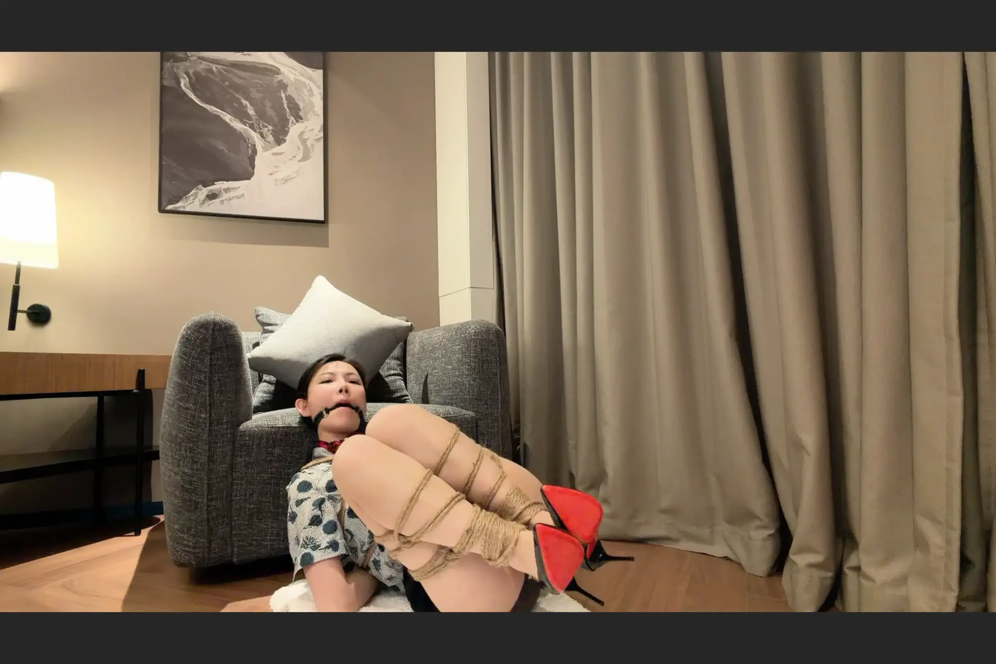 柳洋在酒店拍摄的,空姐装、肉丝高跟,折叠腿自缚、挣扎、解缚,口球流口水,并在自缚的过程中回答多个访谈问题,介绍心路历程。