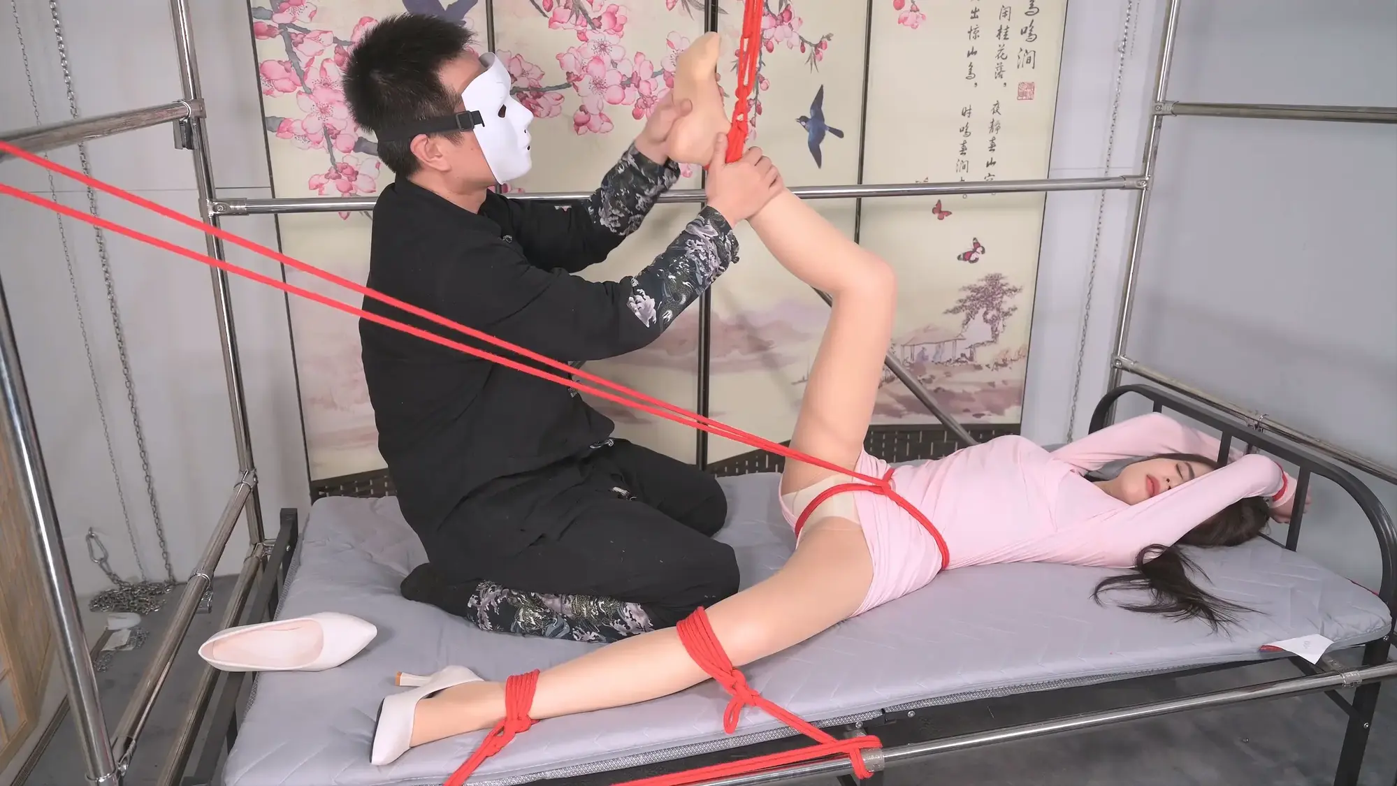 言妍的腿可谓标准的美腿,上下的粗细比例以及腿型、线条、质感与整体气质的都是那么的匀称和谐,增一分则太长,减一分则太短,粗一分则失之丰腴,细一分则失之单薄,而当她穿上高跟,犹如锦上添花,更增添了几分令人心动的魅力,最令人心悸的是高跟里的足弓拱起形成的那分空间,我称之为“弓悬领域”,这分由足弓拱起而形成的小小空间,正是高跟鞋美学中的点睛之笔,言妍的美脚把她完美演绎,它打破了鞋面与脚底之间的沉闷,创造出光影变幻的层次,让观者的目光有了停泊和想象的余地。这个小小空间,让整体造型从“包裹”走向了“塑造”,赋予了无限悸动的想象,我忍不住用手指去扣去探索,想用最敏感的神经去链接现实与想象,伴随着美女的娇嗔和微微挣扎扭动,那是被触动后最本能的涟漪,此刻与她微微绷紧的身体曲线遥相呼应,共同构成想象与束缚与现实的绝妙轮回。为了这美腿的极致体现,特意把另一条腿高高吊起,展现了一道从脚踝到大腿根的完美的抛物线,她不自主的勾动脚尖,让被迫拉伸的玉腿灵动而性感。沐小雨女王的加入,仿佛也受了眼前曼妙身姿的影响,让气氛变得暧昧起来,我们互相配合着,每当她用工具去刺激言妍的身体,我便按住她扭动的肢体,用一种不容置疑却又小心翼翼的力量,将她牢牢固定在我的手中,是在告诉她:在我们手里,你没有退路,只能面对!这一次次小小的博弈,不在于让她无法动弹,而在于让她最终心甘情愿地放弃抵抗,随着娇嗔和反抗渐渐无力,沐小雨女王拥着言妍入眠,她们依偎的姿态,宛如一阕未完的古典乐章。