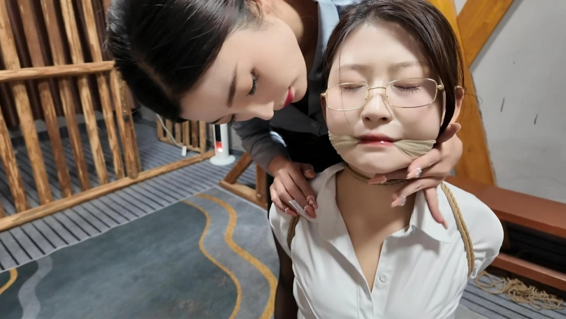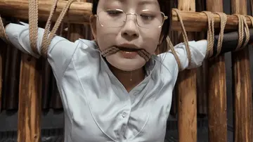 闺蜜之恋,佳佳变身女s调J晓琴,绑到木牢边上,m腿,上身双臂伸开,脚趾绑上,还要固定棒棒,这个姿势非常难受,再加上棒棒刺激,很快晓琴就受不了