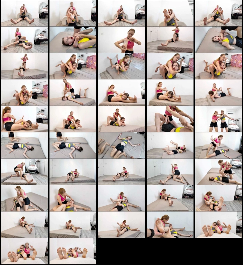Lizy (Pink top) completely dominates and destroys poor Emma with various wrestling moves and humiliates Emma.